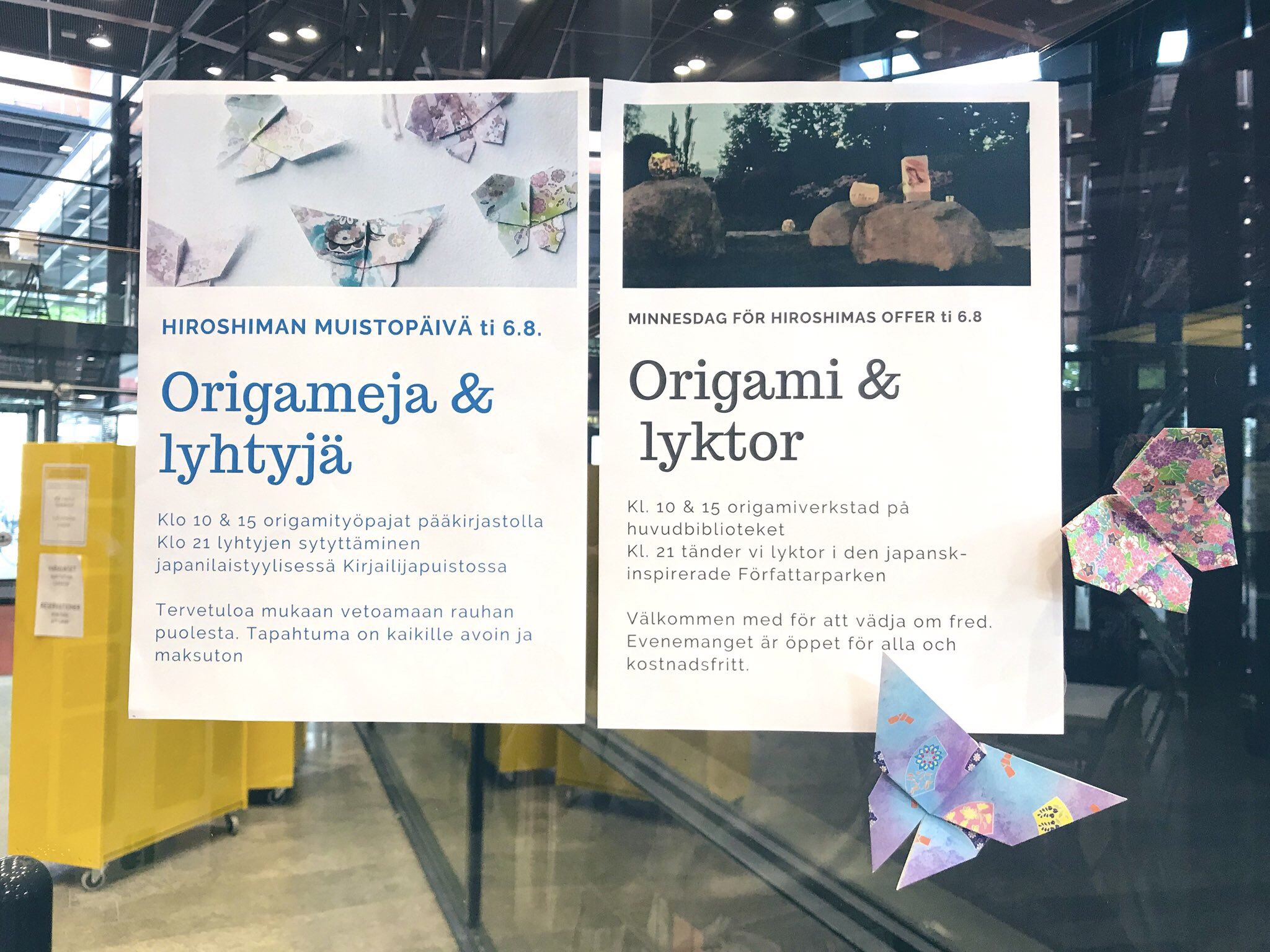 ポルヴォーの市立図書館では、8月6日、ヒロシマを思い出す日として折り紙のワークショップと日本風のランタンに灯をともすイベントが開催されていたので、参加してきました。