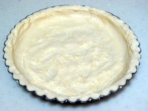 2.1)に水を入れて混ぜ生地を作る。型に生地を入れて指を使って全体に伸ばす。ベタベタした扱いにくい生地ですが、のんびり焦らず伸ばしてください。最後に指に水をつけてなぜるときれいになります。