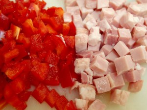 1.パプリカとハムを小さく切って型に入れる。