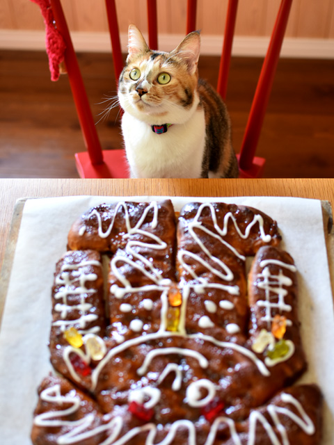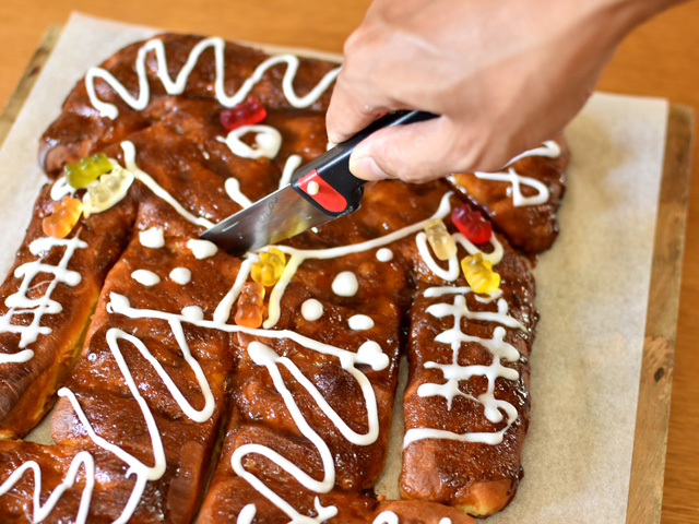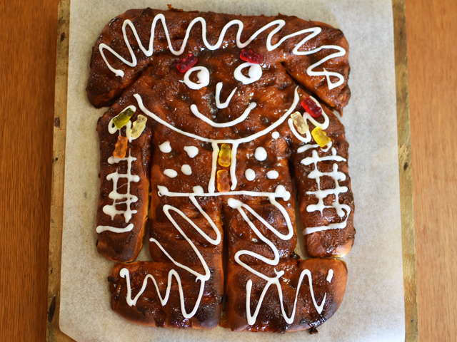 表面カリッ、内側ふんわりのパン生地に、ねっとりしていながら、部分的にカラメル状になったグレーズが香ばしくて美味しいです。もちろん人の形にしなくても、四角いまま焼き上げてOK。残ったら冷蔵庫で保管してレンジで再加熱すればフワフワに戻ります。