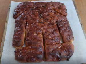 10.200℃に予熱したオーブンで20分焼く。15分くらい経ったら時々チェックしてグレーズが焦げそうだったら温度を下げるか、場合によっては早めに終了する。グレーズが沸騰してボコボコとしていたらOK。