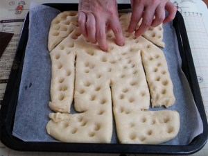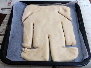 オーブンレンジの天板(25cm×30cmくらい)に合うサイズにしました。我が家のオーブンの天板は30cm角なので両側に空間がありますが、大体25cm×30cmの天板でしたら、全体に生地を広げてください。まだ温かく柔らかいうちに手や足の隙間を広げて形を整えると良いでしょう。