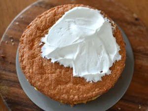 4.残りの半分のスポンジを被せて、泡立てた生クリームで覆う。※ここでいったん冷蔵庫で冷やすとその後の作業が楽になります。