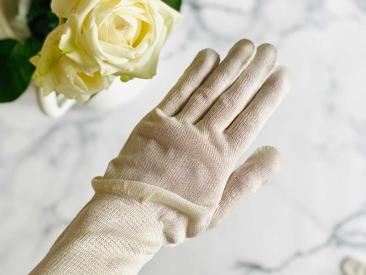 手首の先までしっかりと長さがあるので脱げにくく、また指先までしっかり保湿ケアしてくれるこちらの商品。
