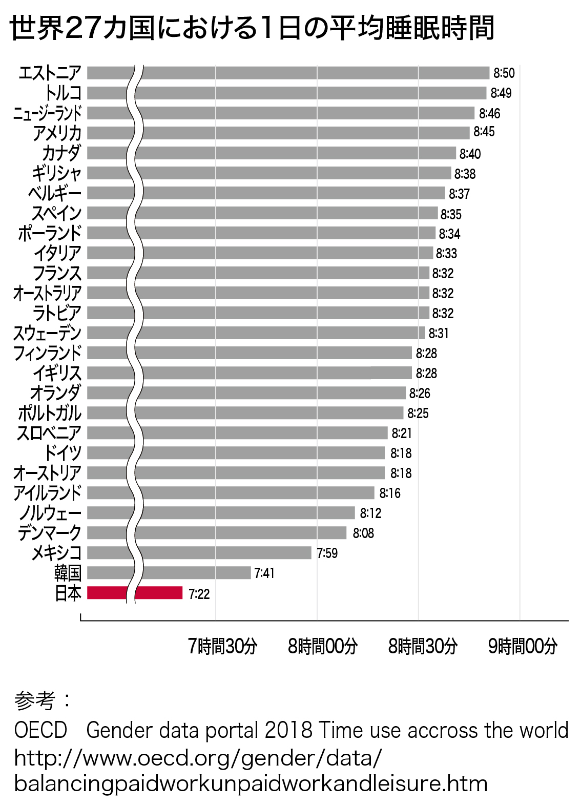 OECD(経済協力開発機構)が2018年に発表した「世界27ケ国の平均睡眠時間の調査 ※15〜64歳の平均」で、日本人は堂々のワースト1位でした。時間は7時間22分。それほど短くないのではと思われますが、アメリカ8時間45分、イギリス8時間28分、ドイツ8時間18分と、先進諸国と比較すると1時間以上短い結果でした。
