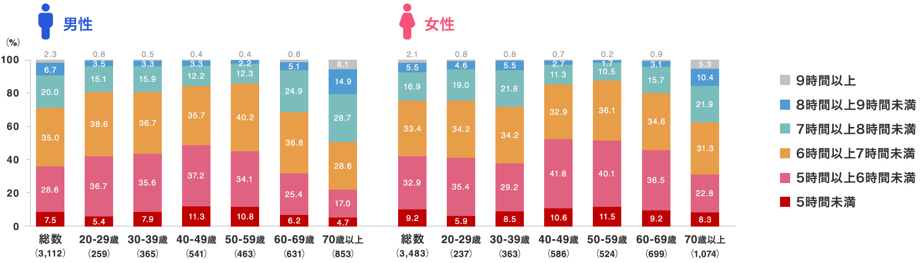 中でも、日本人女性の睡眠が危惧されています。家事や育児の負担が大きく、長い通勤や就業時間も影響して、削るなら睡眠時間しかないというのが実情でしょう。実際、40代〜50代の女性の半数以上が、1日の平均睡眠時間が6時間を切っています。仕事も家庭も忙しい年代、十分な休養がとれていないことが明白です。(厚生労働省 平成29年「2015年 国民健康・栄養調査」より)