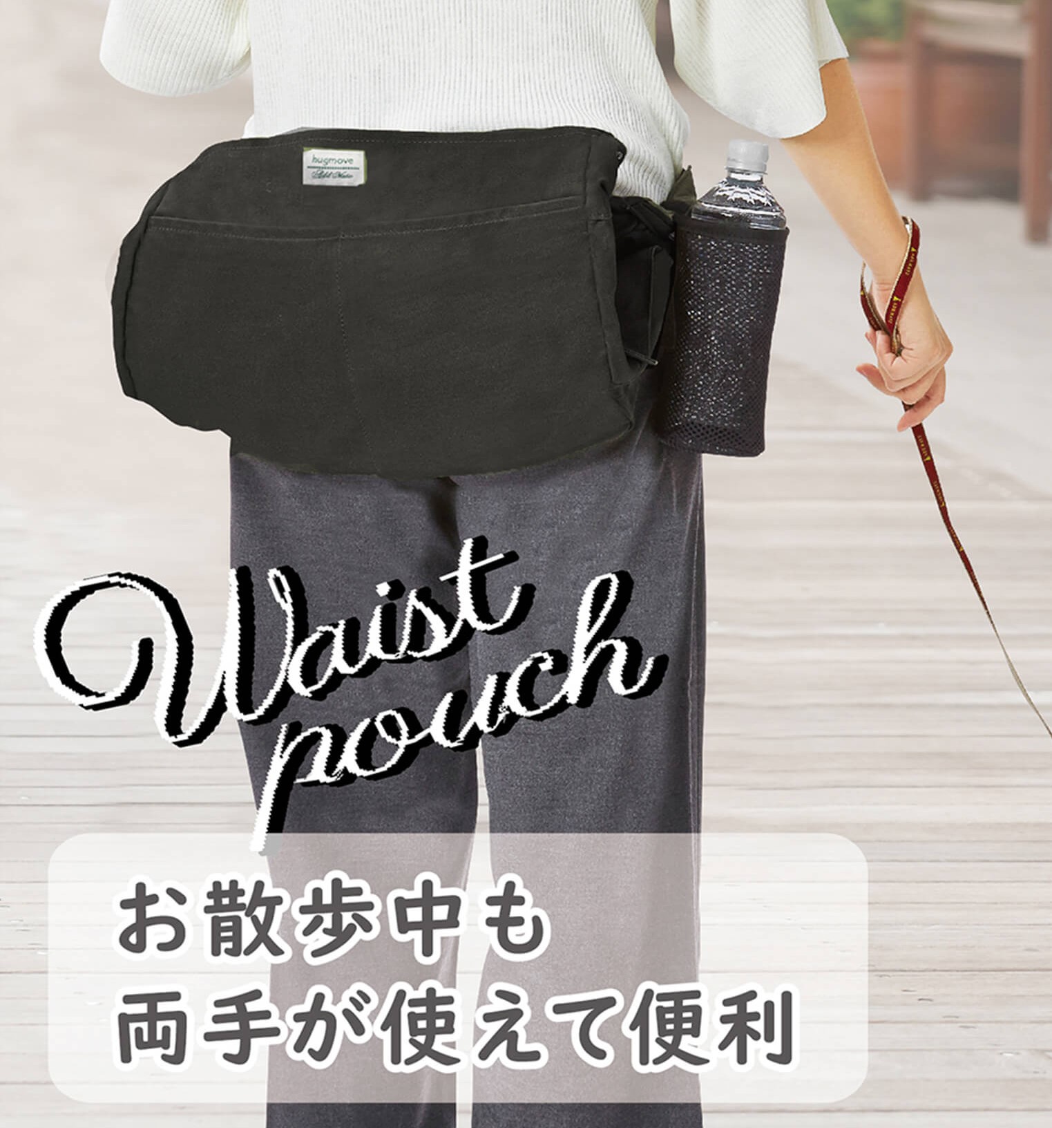 両肩ショルダー仕様で肩への負担を軽減できます。使わないときはコンパクトに畳んで、ウェストポーチのように腰に付けられるので両手が空いて便利。腰に付けてお散歩に出かければ、途中で疲れて歩きたくない…となったときにも役立ってくれます。