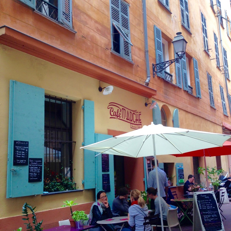 ビーチ沿いで軽く1杯シャンパンを飲みながら、どうしてもここでオーダーしたかったニース風サラダを食べ(*英語ではニシソワーズサラダです)、 飲食店や雑貨店が並ぶ街の中心地へ!