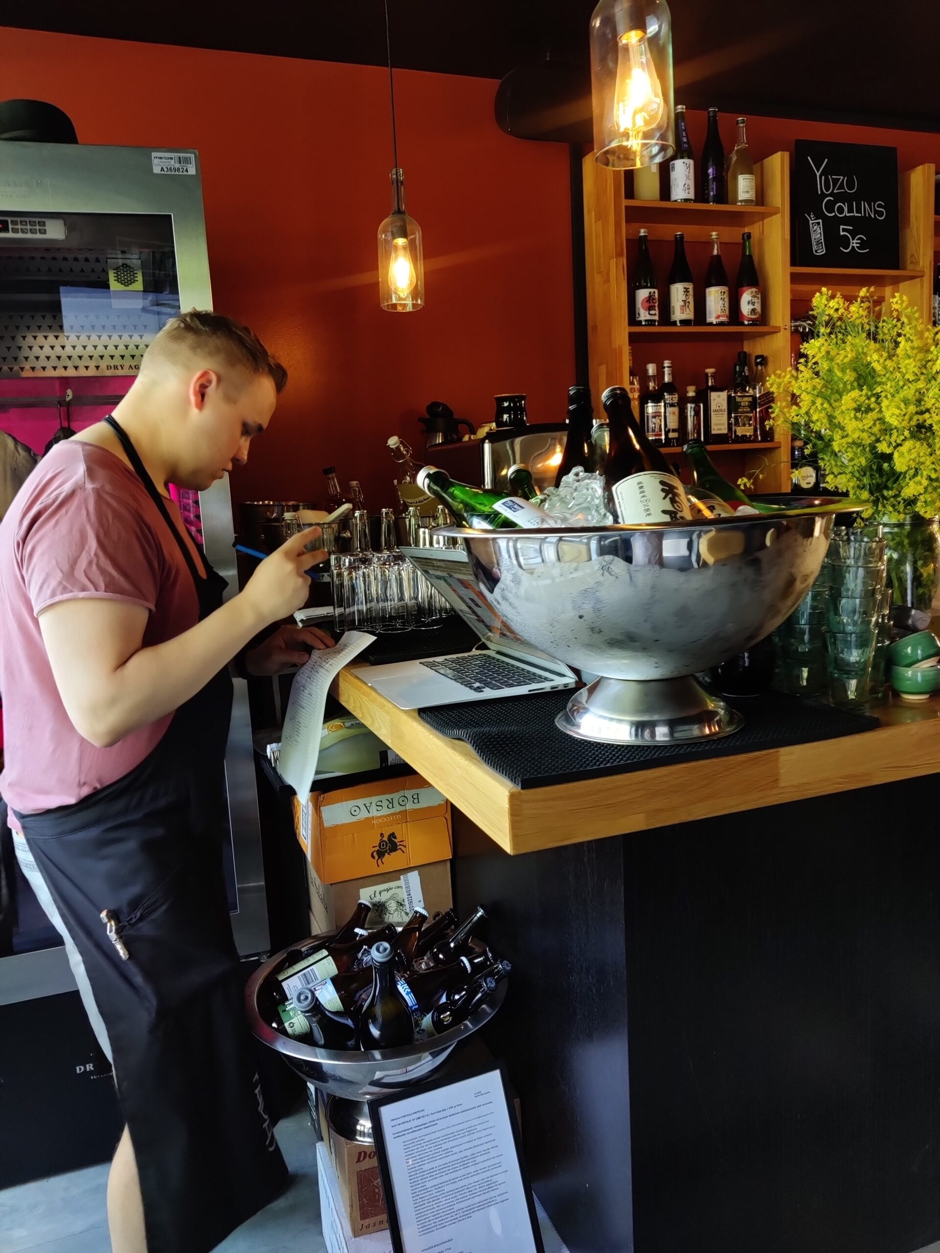 今回「うちでポップアップ居酒屋をしない?」と声をかけてくれたのはタンペレのKajoというレストランで、まだオープンしてから3年足らずですが、「フィンランドのベスト50レストラン」に選ばれ続けている実力店です。レストランに隣接しているワインバーの雰囲気が日本の居酒屋っぽかったので、そちらを使わせてもらうことにして、4日間のイベントをオーガナイズしたのでした。