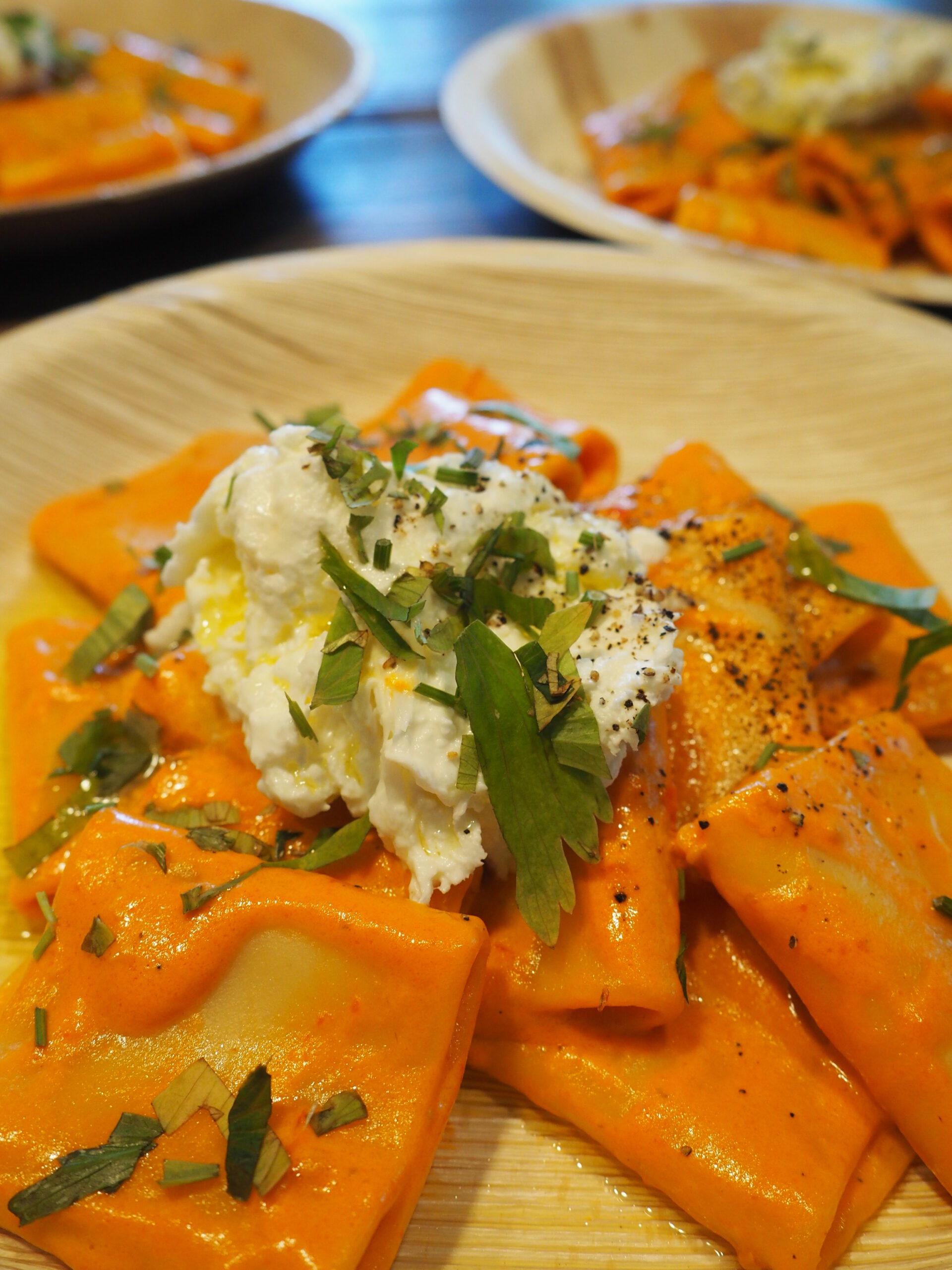 1日目のランチはグリーンサラダとパッケリ・アッラ・ウォッカ(ウォッカとクリーム、トマトのソースのウォッカ・アッラ・ペンネのパッケリバージョン)とブッラータチーズを作りました。