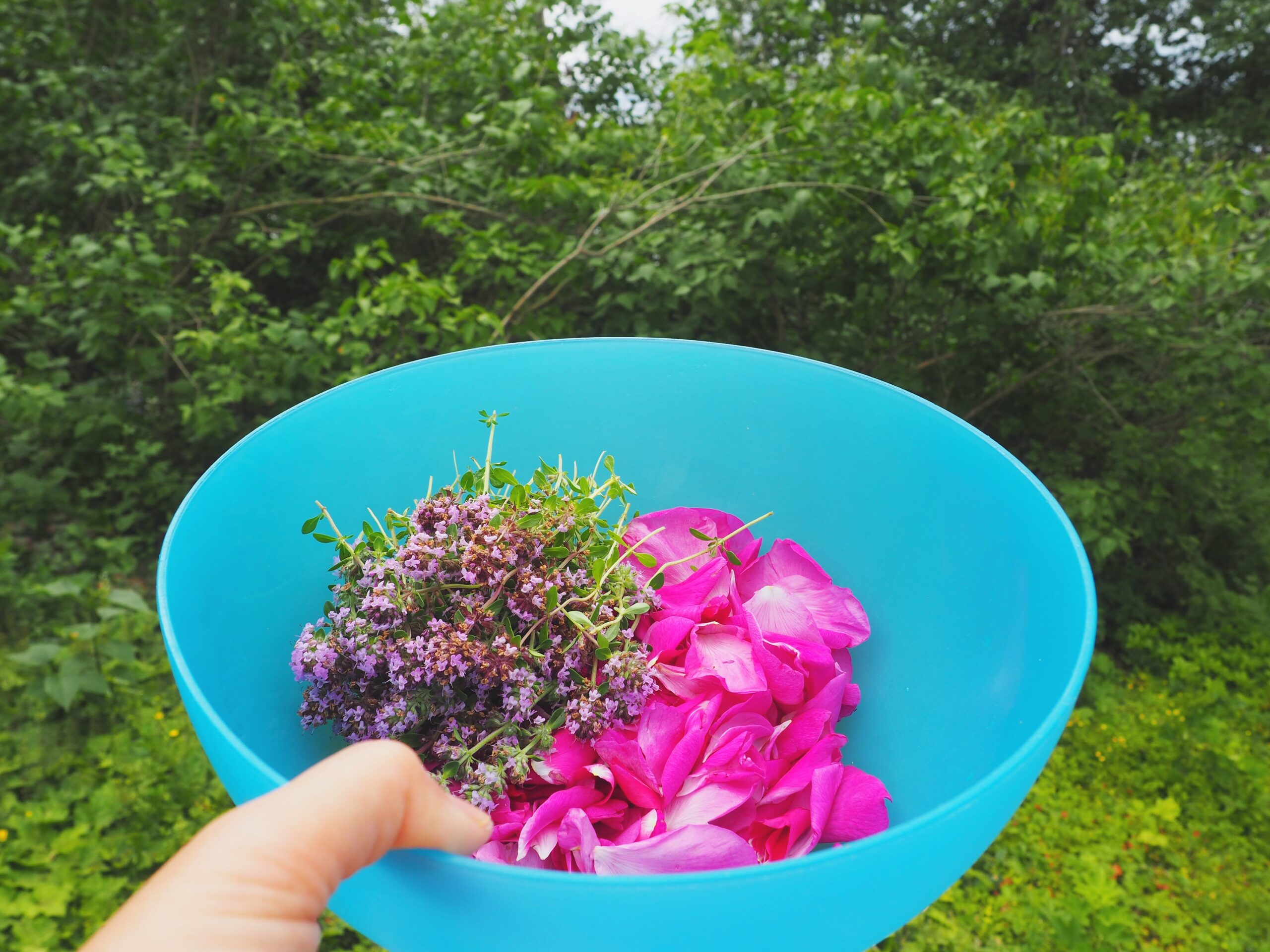 午後は食材探しに庭へ。ばらやタイムのほか、パイナップルウィードという、カモミールに近い野草を採りました。