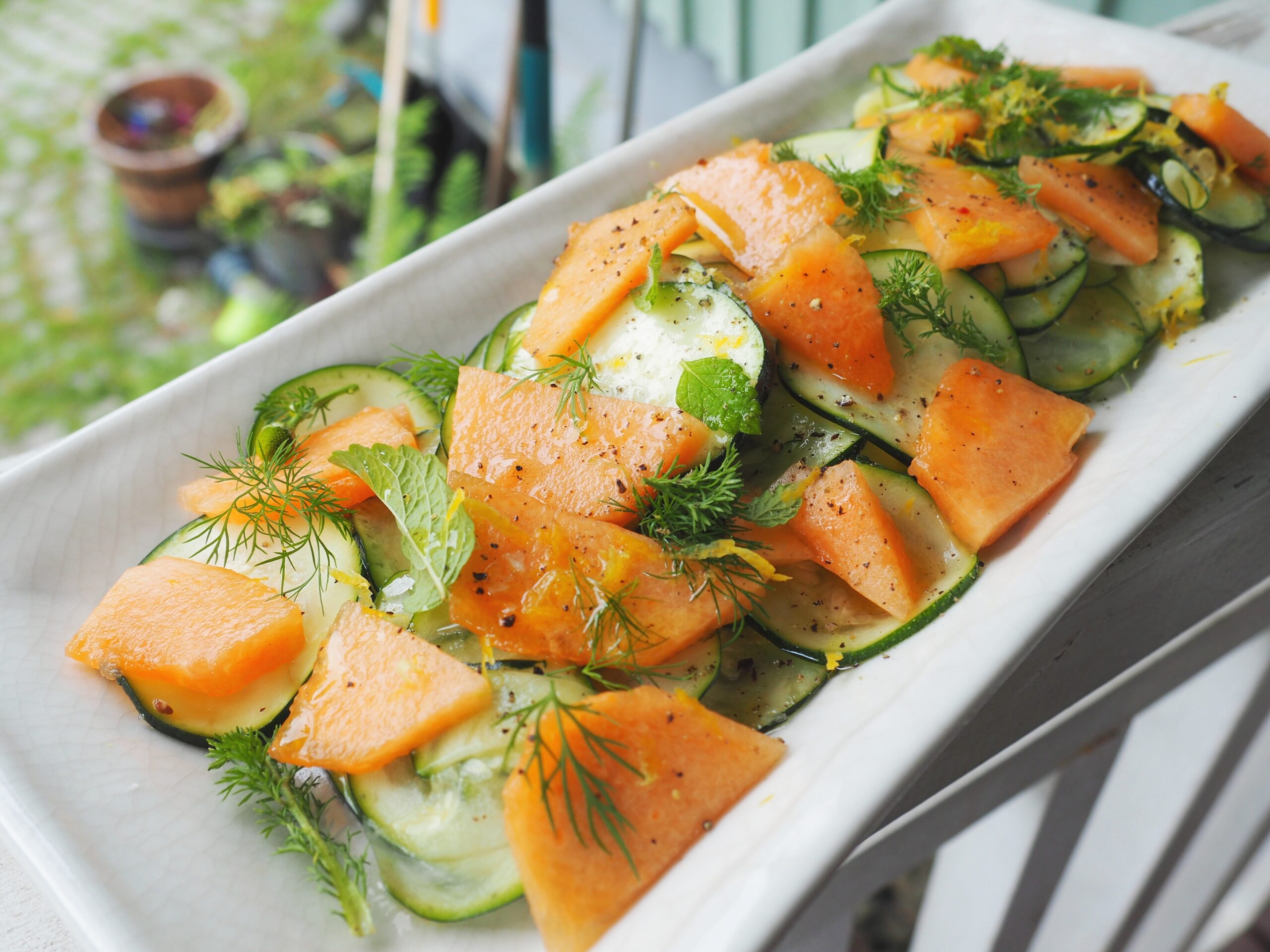 ディナーは「大皿料理で数人で取り分けられるスタイルで、フィンランドの夏を中心に日本のひねりも少しある簡単に食べられる料理」というご要望をいただいたので、前菜は毎夏作っている花のバターや採れたて人参のヨーグルトと自家製七味唐辛子のソース、メロンとズッキーニのカルパッチョなどを作りました。爽やかな夏の味です 。