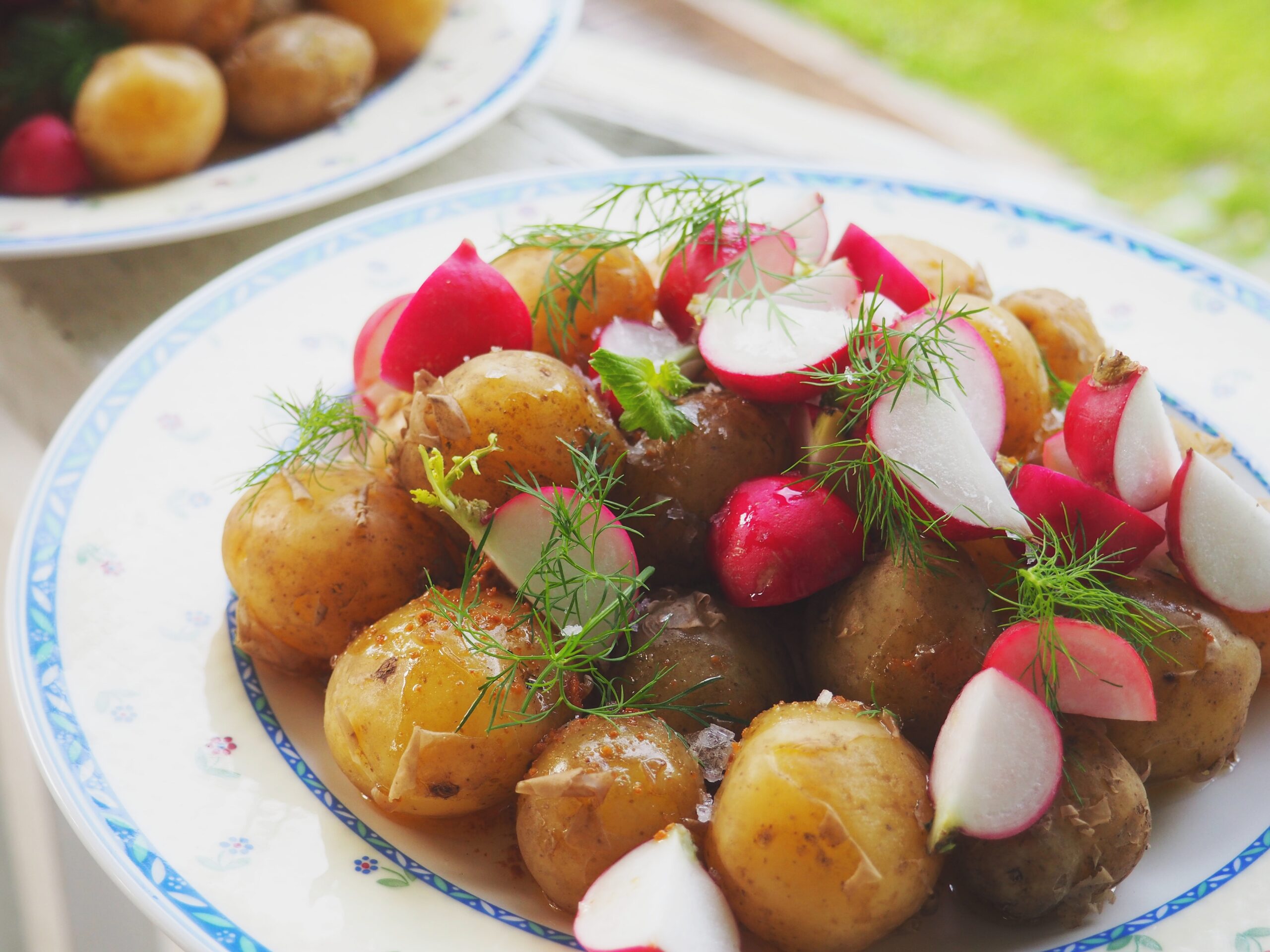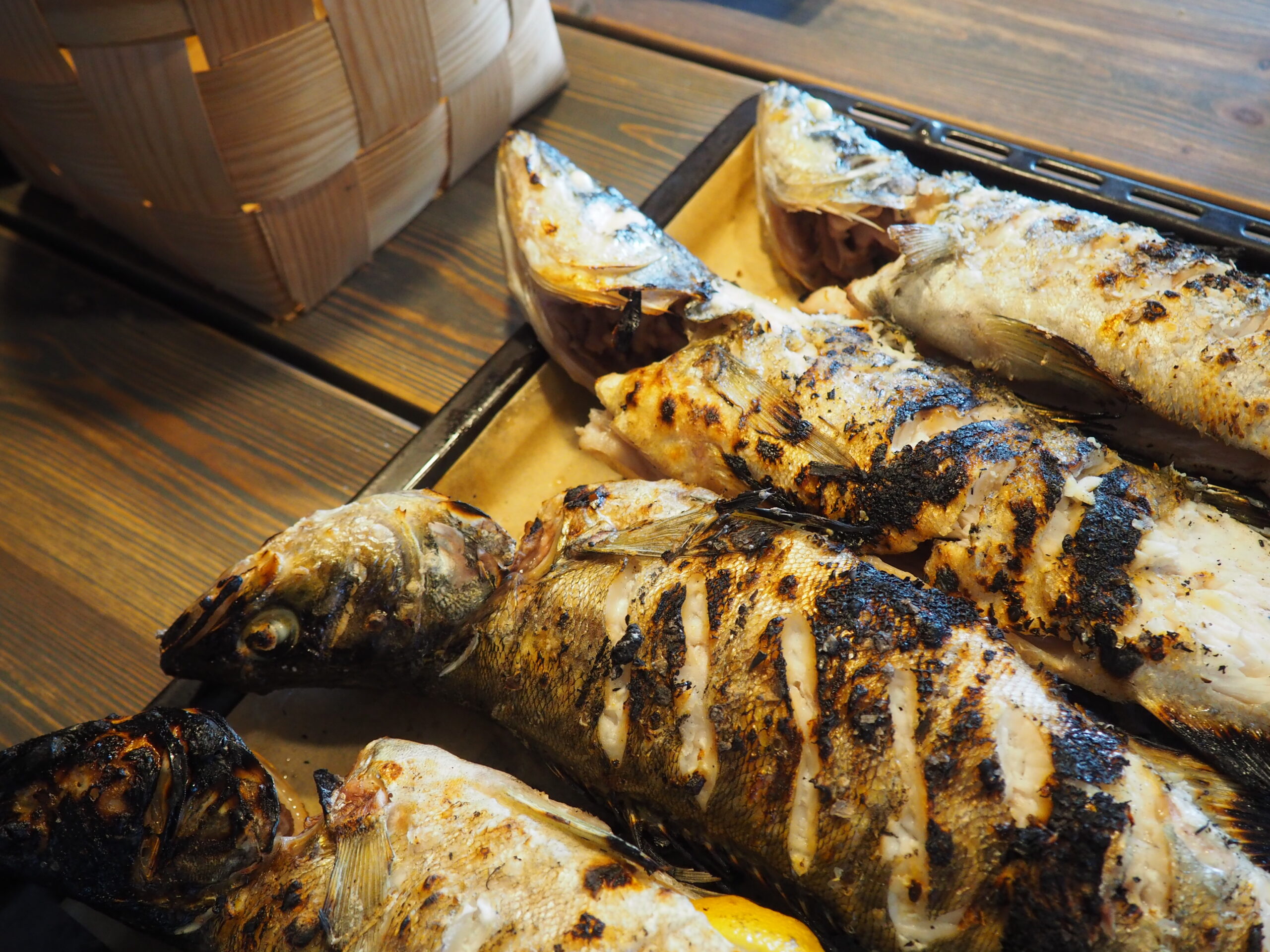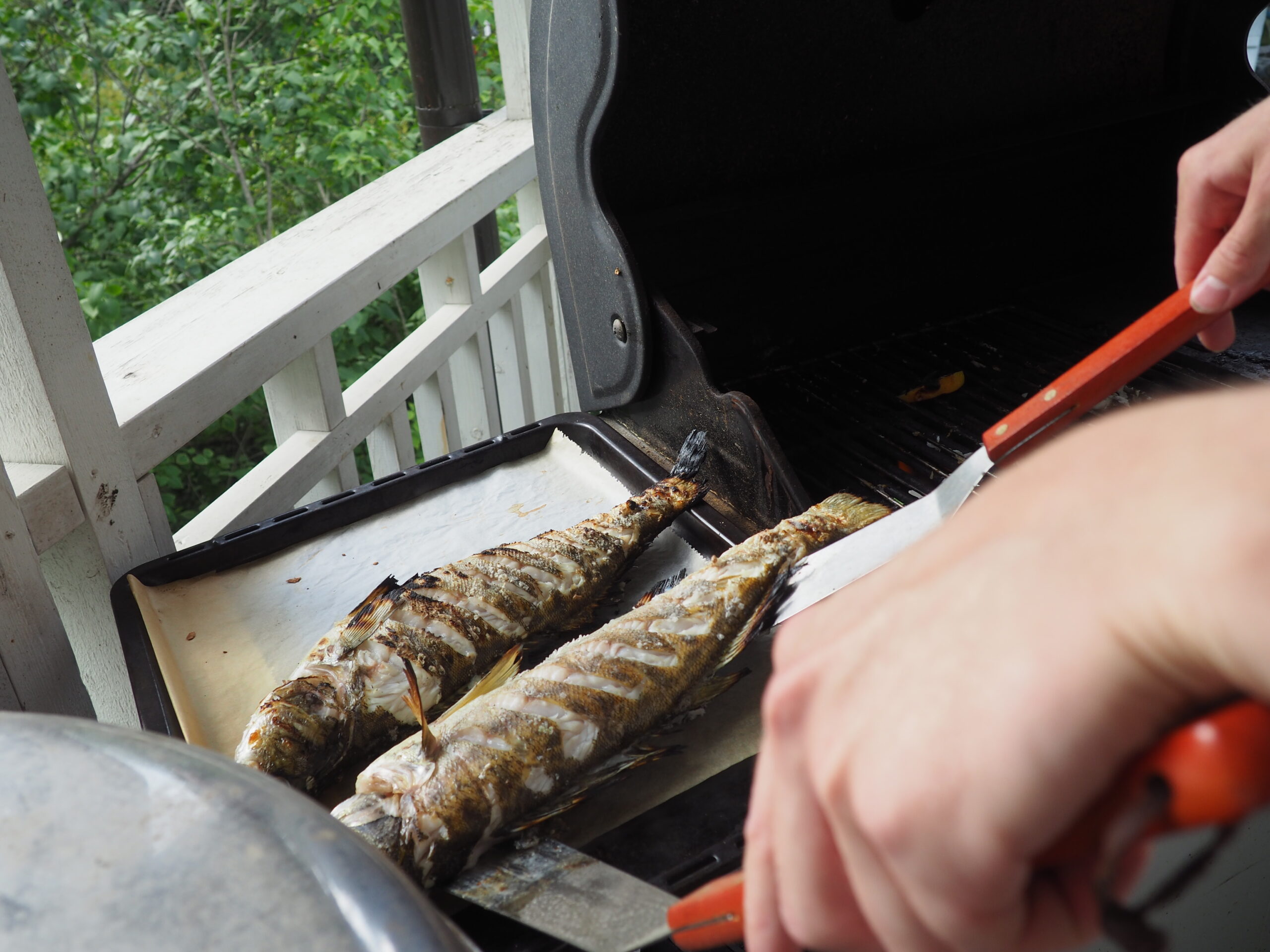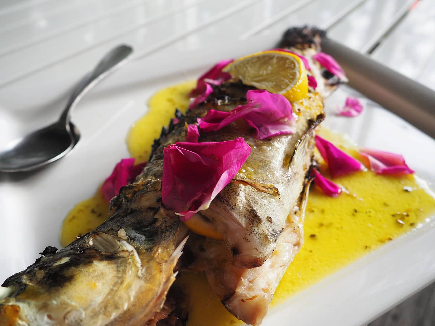 メインディッシュは地元の湖で採れた、大きく育った新鮮なクハ(パイクパーチ)を塩だけで味付けしてレモンを添えたグリルした、つまりは焼き魚でした。魚を焼いていると日本の香り〜!と嬉しくなりました。まるで炉端焼き。オレガノとレモンのソースと庭の薔薇を添えて。