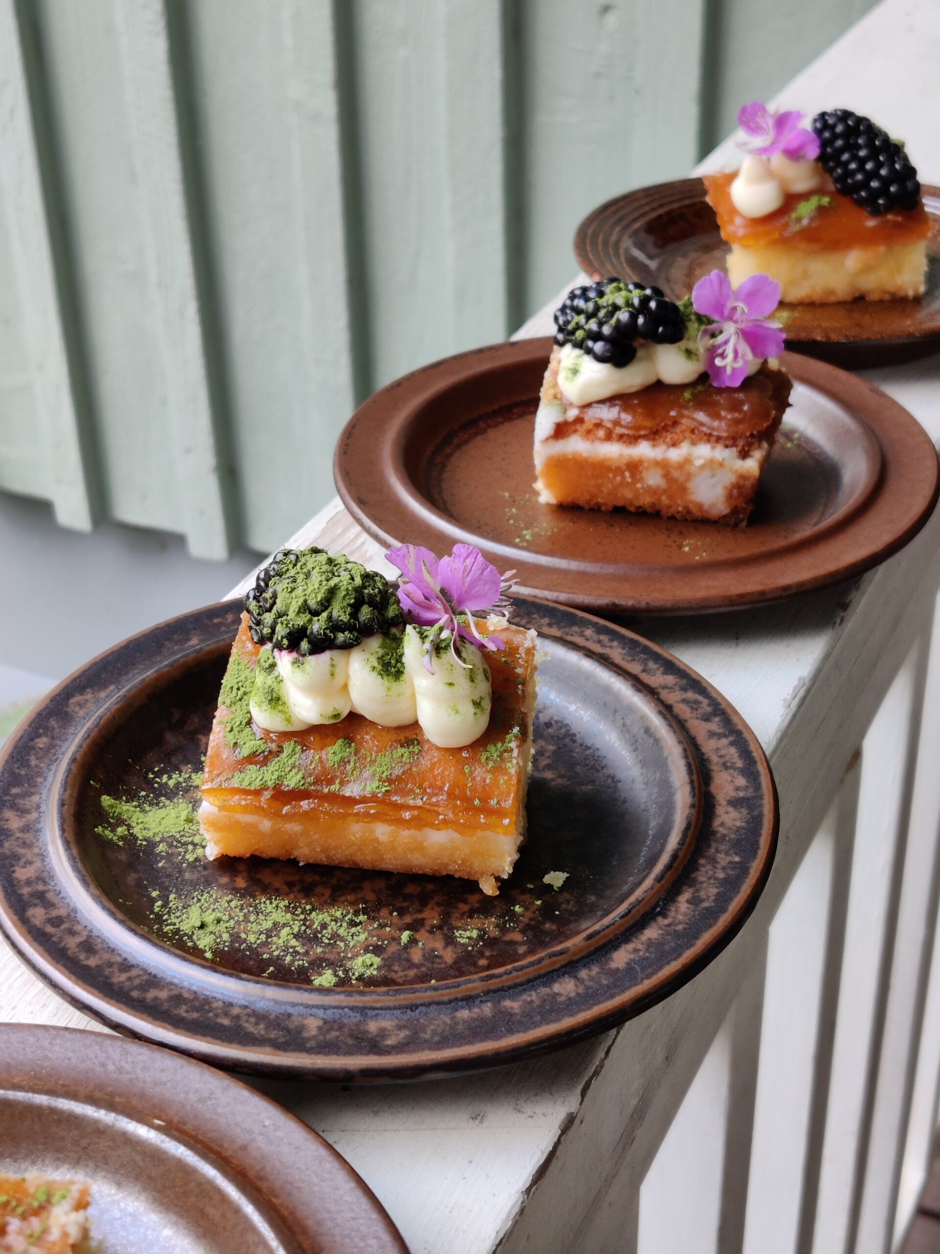 デザートはレモンとアプリコットのケーキに、レモンチーズクリームとブラックベリーと抹茶添え。