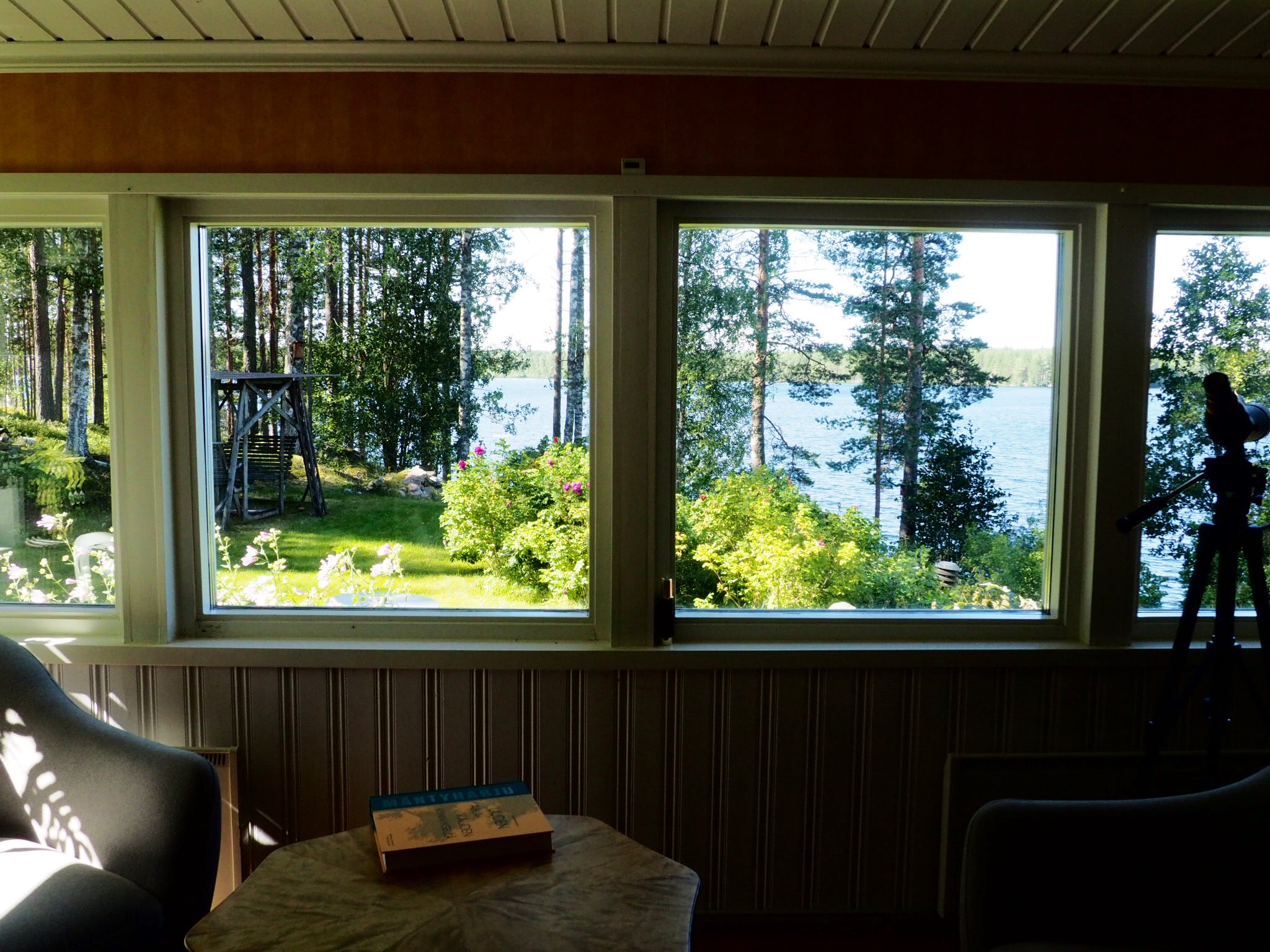 コテージはいくつもあり、朝起きると森と湖が見える窓から射す光がやさしいです。空気が澄んでいるため、8月に行くと夜は星が無数に見えて、流れ星も5回くらい見れてロマンチックですが、今回は7月上旬に訪れたため、白夜でなかなか空が暗くなりませんでした。それもまた良いものです。