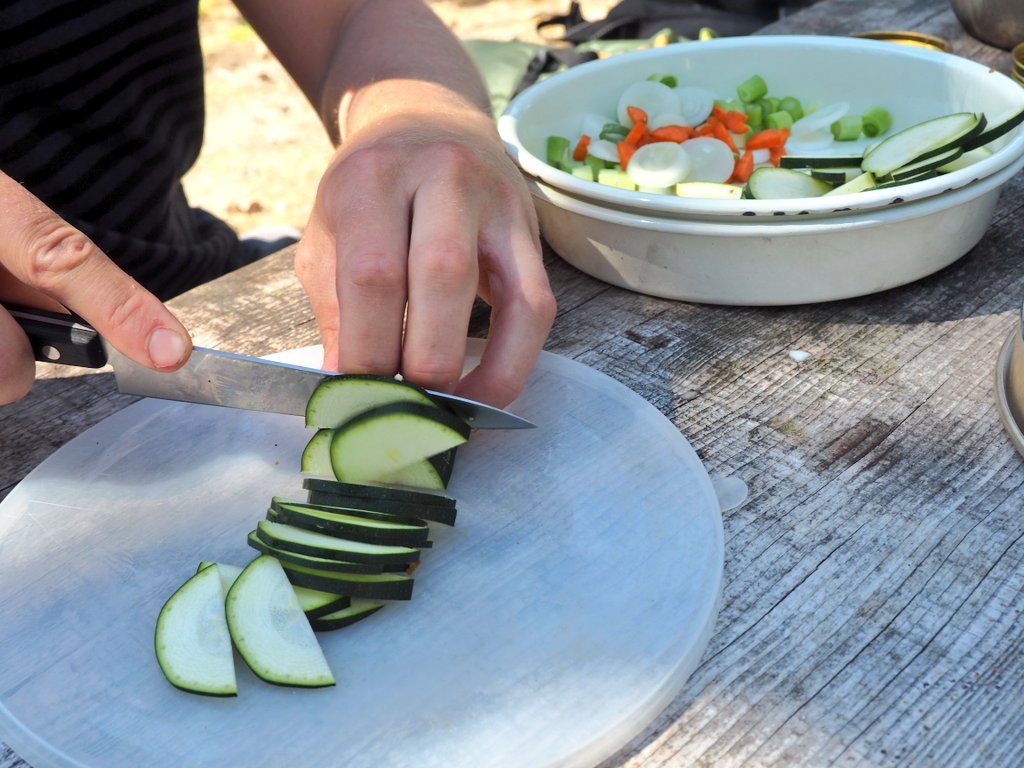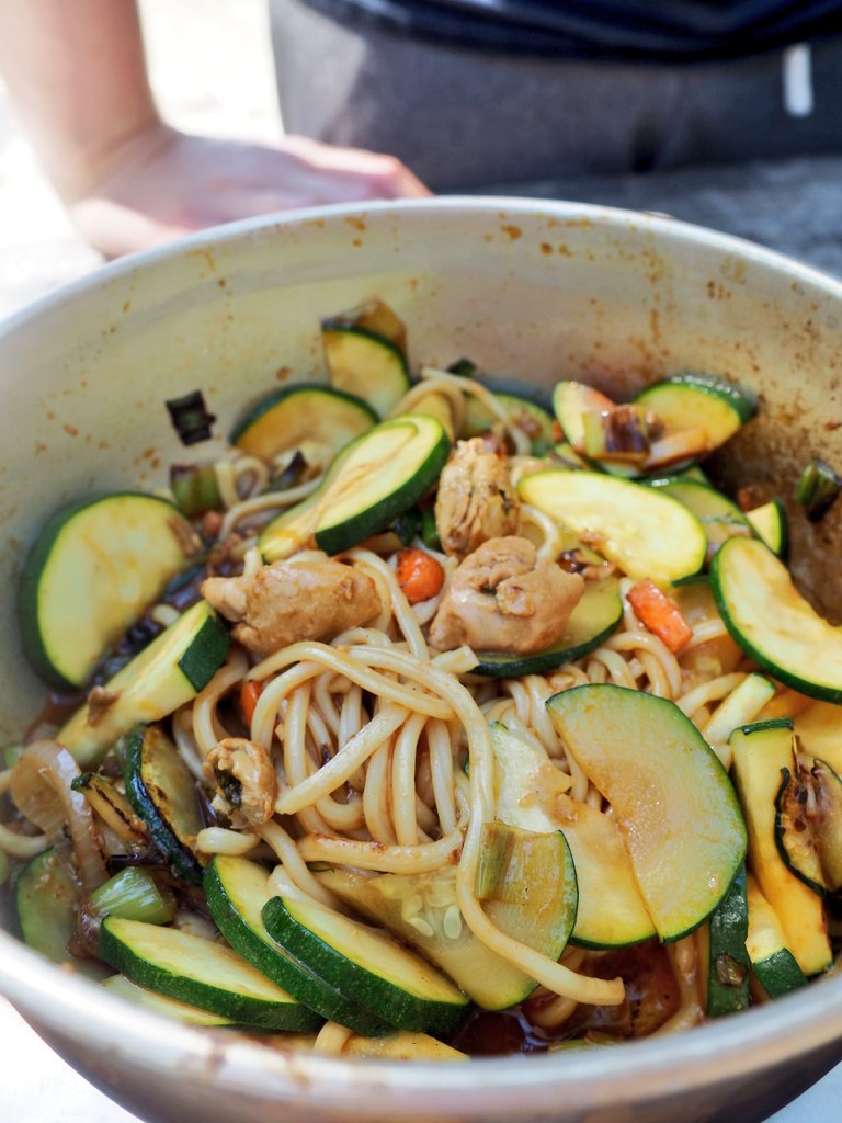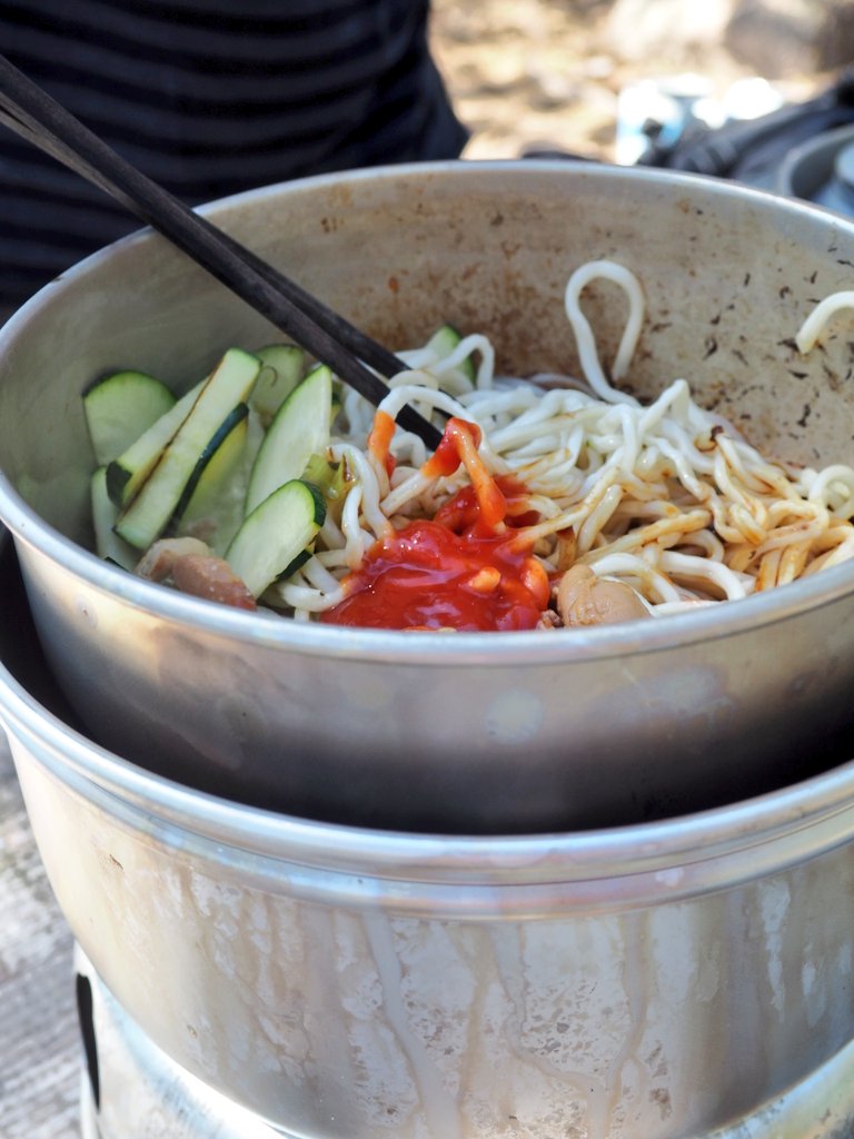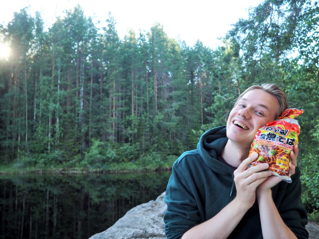 キャンプでの楽しみのひとつはキャンプご飯!一日目は常温でも美味しい日本製の焼きそば。人参とkevätsipli(青ねぎもついた新玉ねぎみたいな野菜)のみでもぐんと美味しいのは付属のソースのおかげ。重いバックパックを背負って汗だくで歩いた後に静かな湖畔で食べるアツアツの焼きそばに敵うものなしです。