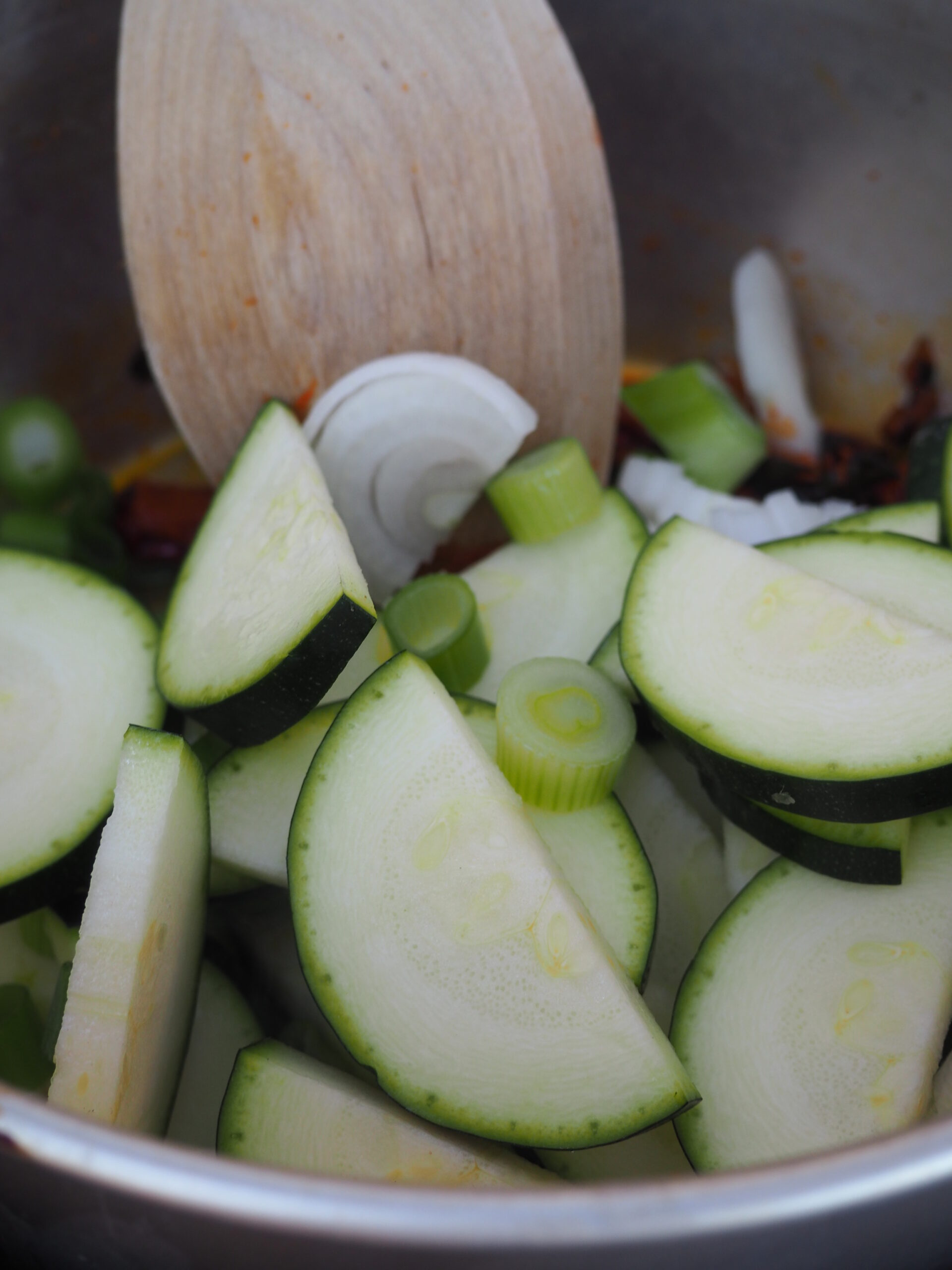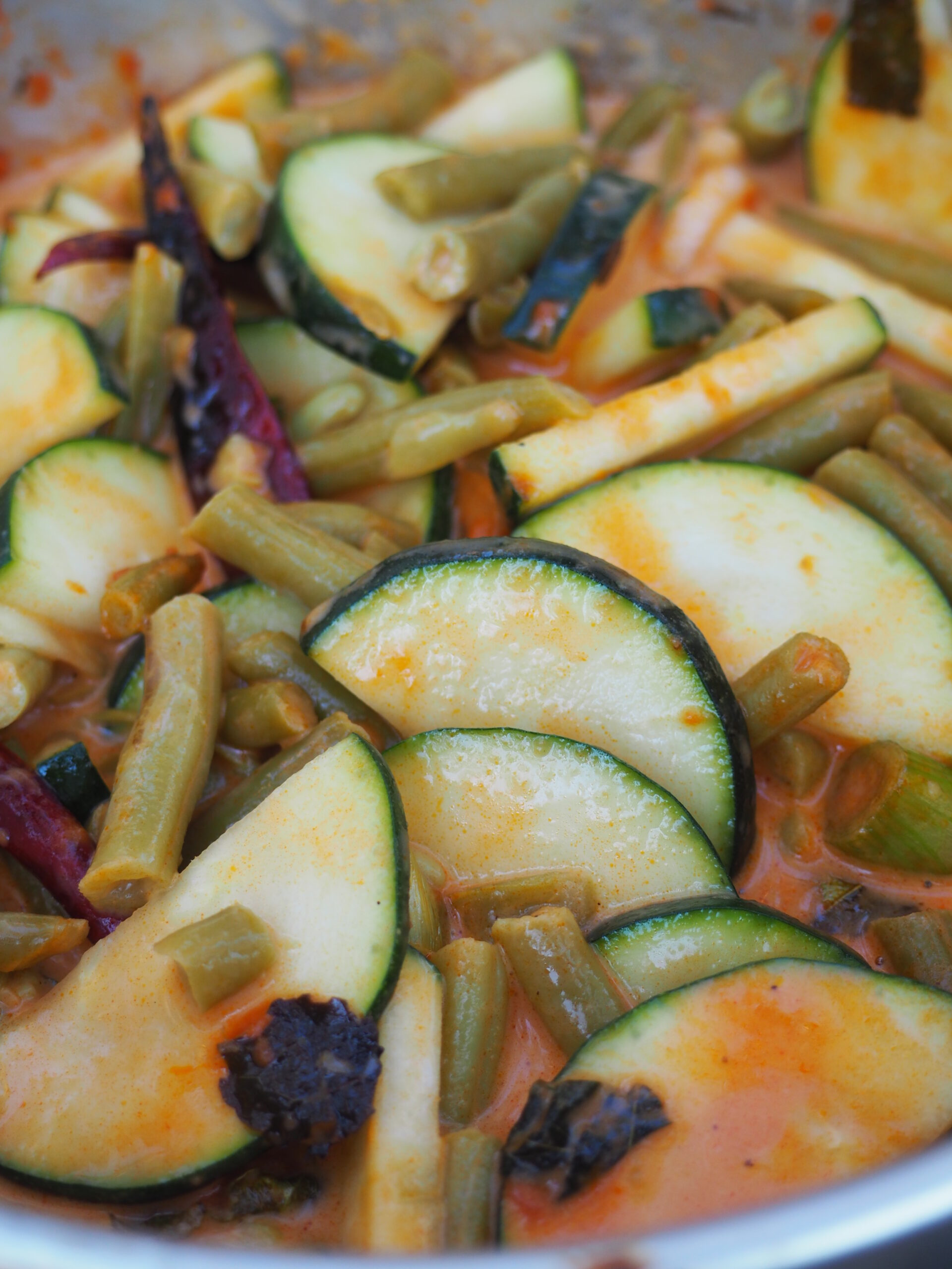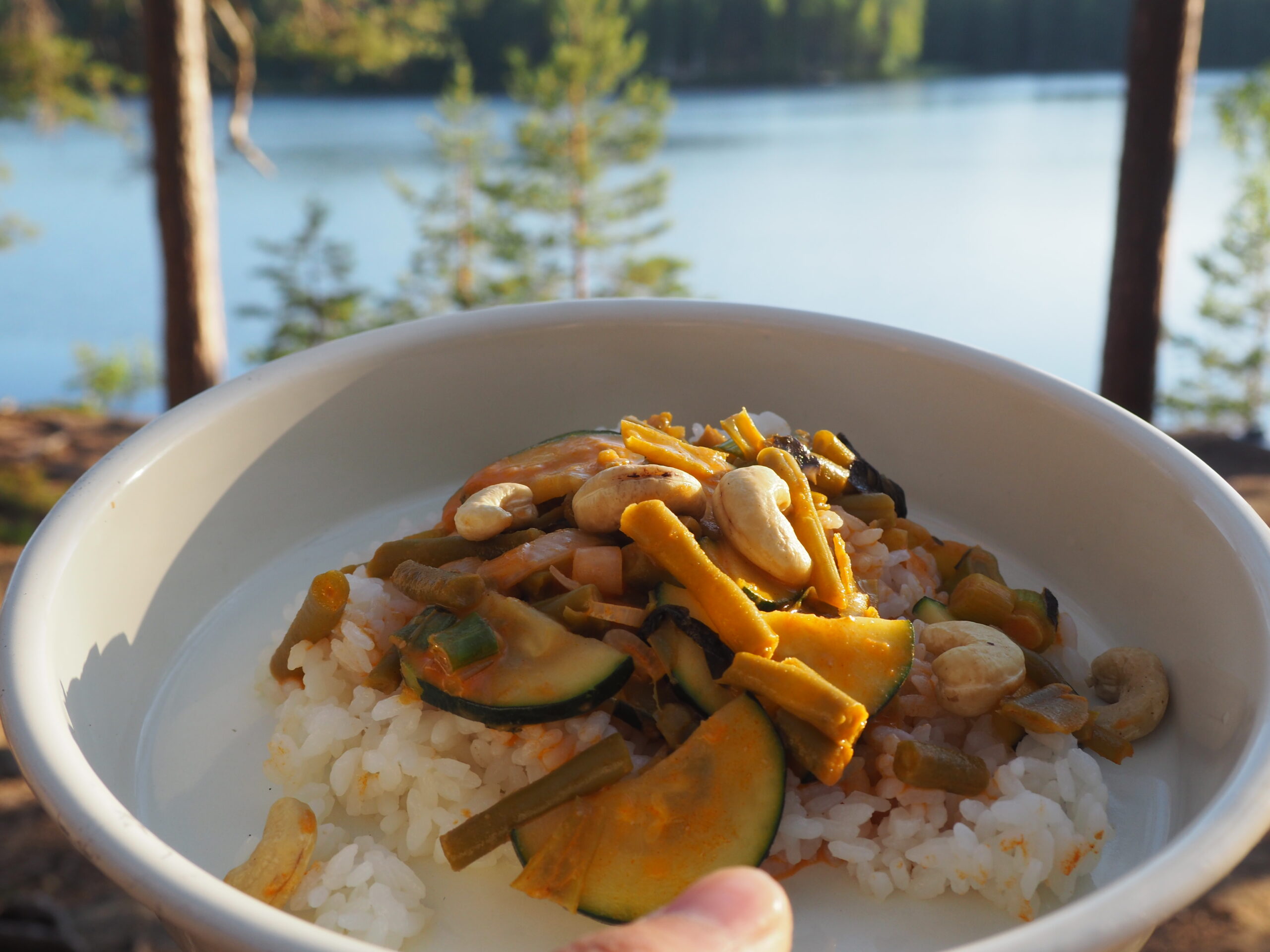キャンプ2日目の夜はレッドカレー!湖の水でキャンプご飯を炊いて、スパイスからカレーを作りました。缶のいんげん豆、ズッキーニ、玉ねぎのベジタリアンカレー。カシューナッツを添えてもぐもぐ。