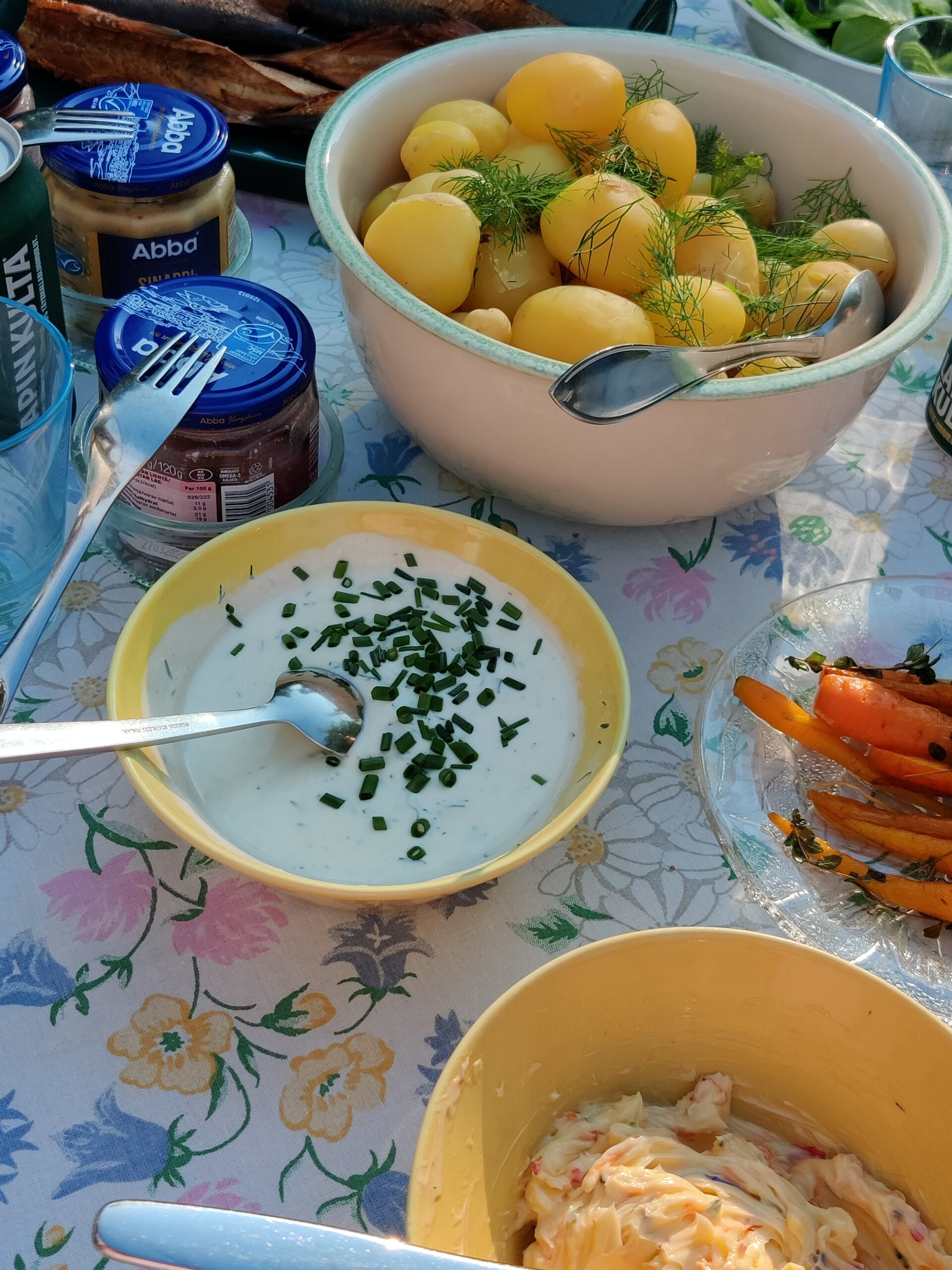 一方、夫の実家の一軒家には家の造り上、熱がこもってとてもじゃないけど家の中にいられないため、家族の皆は涼しくなるまで基本的に庭で生活します。朝起きたら庭で朝ごはんを食べ、庭で本を読んだりおしゃべりしたりします。ちょこちょこと庭仕事をし、泳ぎから戻ってきたら庭で休む、と庭でずっと過ごすのです。この日は家族揃っての晩ごはん。自分たちの庭の畑で採れたサマーポテト、人参、ハーブのほか、夏の風味たっぷりの花のバター、スモークした白身魚などを食べました。