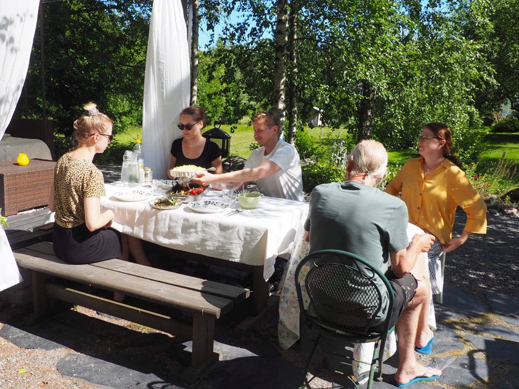 家族は全員スウェーデン語が第一言語なので終始スウェーデン語で話します。この日の話題は夏休み、仕事のこと、庭造り(今年はあの花は咲かなかったとかあの花は場所を変えたとか)、昔の思い出話、方言、コロナの状況についてなどでした。 昔話で面白かったのは「1969年のフィンランドではアルコール販売の法律が今よりずっと厳しくて(今も日本よりはかなり厳しい)、ビール1本を買うのに必ずサンドイッチも1つ買わないといけないという法律があった」こと。サンドイッチは便宜上売られていて誰も食べないので全然美味しくなかったそう。サンドイッチをようやくたいらげて、2杯目のビールを飲みたいな…という時はやっぱりサンドイッチを買わなくてはならなかったそうです(笑)。そんな昔話を面白おかしく語ってくれるお義父さんは70歳。この日は夫のご両親の結婚40周年記念日だったので、昔話にもいっそう花が咲きました。