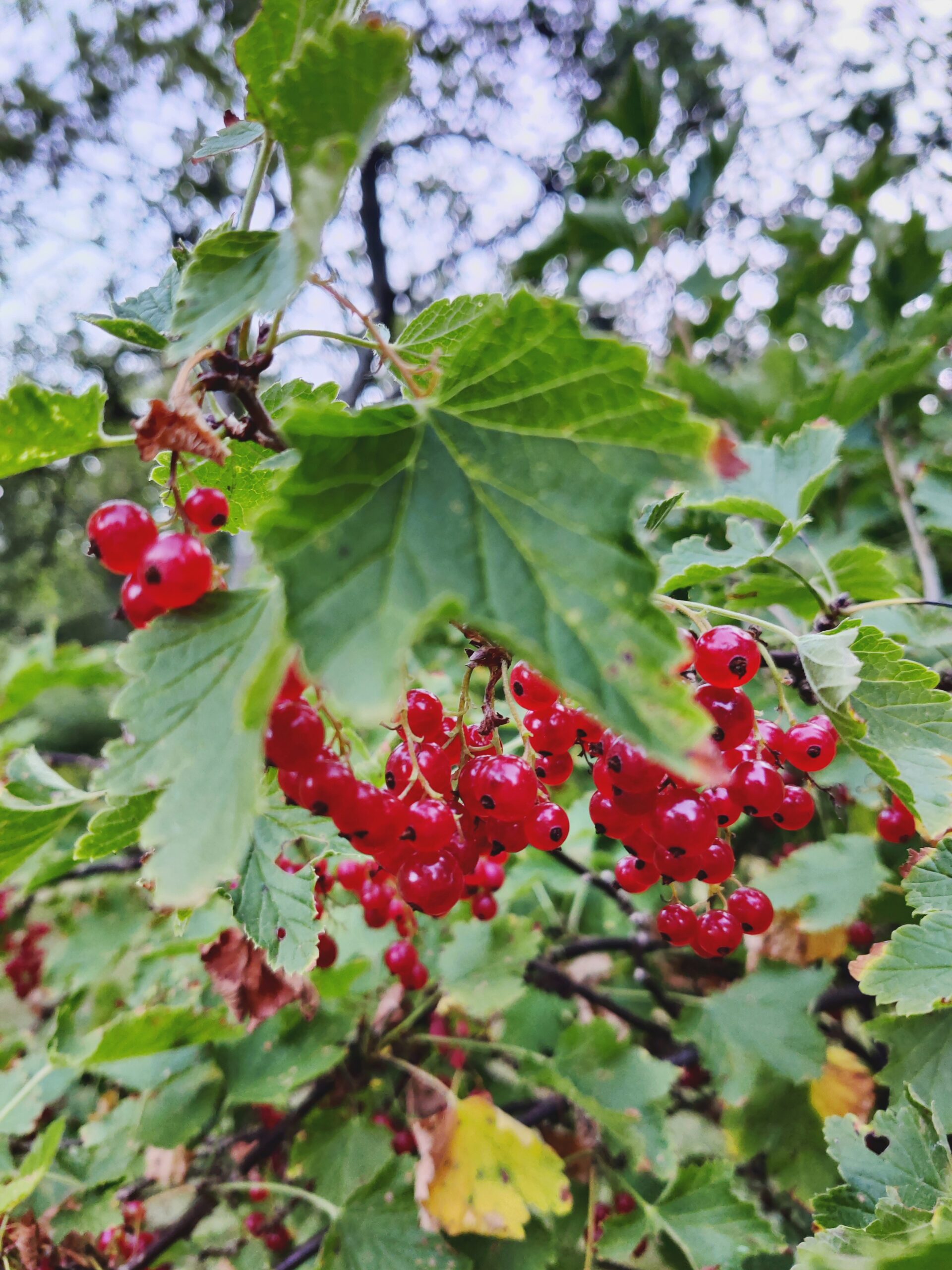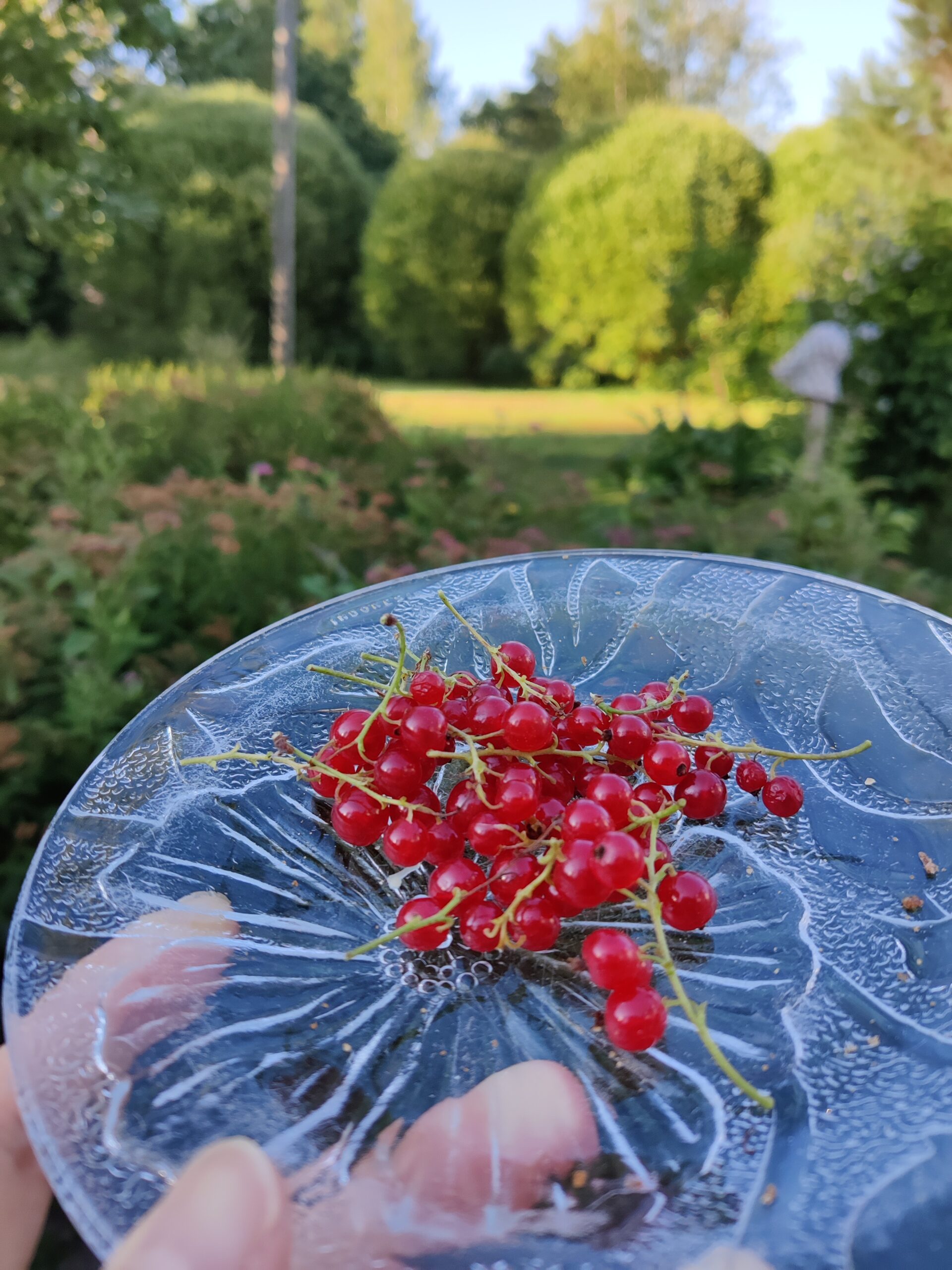 庭にたくさん実っているのは赤スグリ(punaherkka/röd vinbär)で、ヨーロッパでは古くからジャムや果実酒、料理など食用されてきたベリーです。光にあてるとまるで宝石ような美しい実で、そのままパクパク食べても良いし、チーズに合わせても美味しいです。
