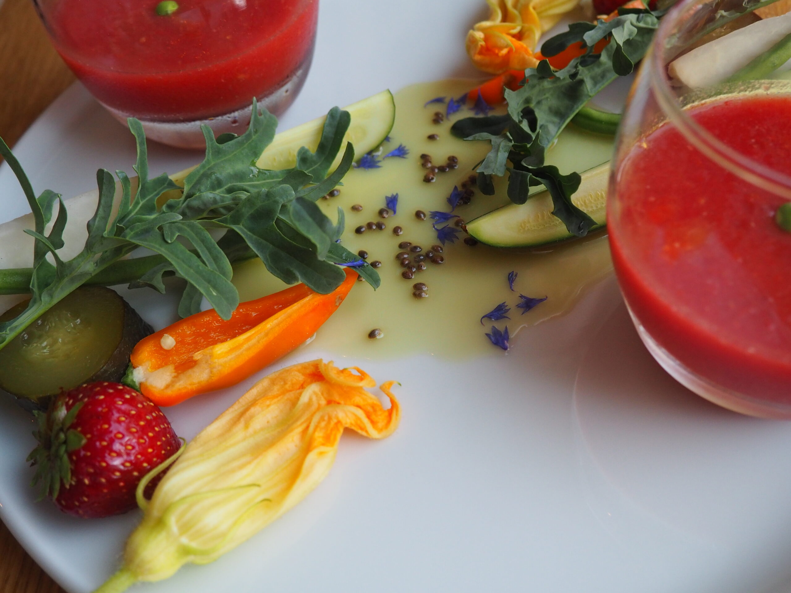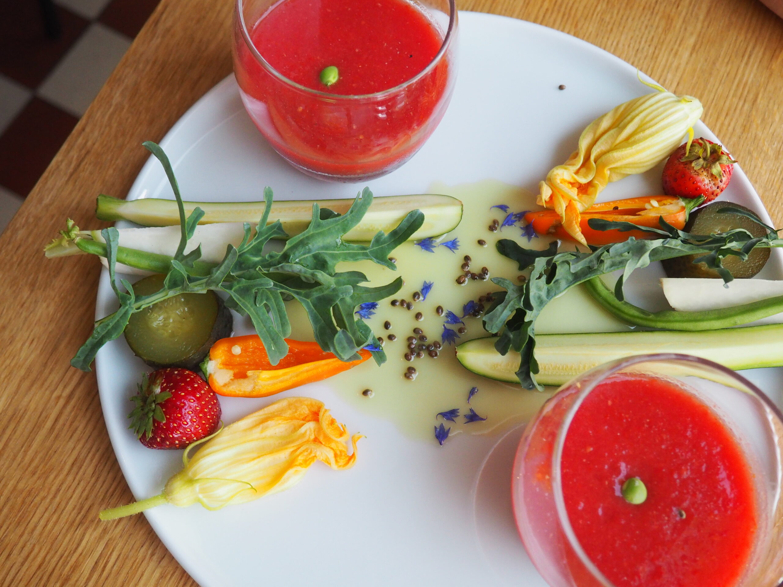 野菜の前菜も美味しい!前菜は一種類だけで、その名も「野菜の前菜」。旬の美味しい野菜をヘンプのヴィネグレットソースにつけてバーニャカウダのような要領で食べるのですが、野菜がとーってもみずみずしくて忘れられない味と食感でした。ヘンプの香りがナッツのようで、プレゼンテーションも美しく、ガスパチョもあってお腹も膨らむサイコーの前菜でした。