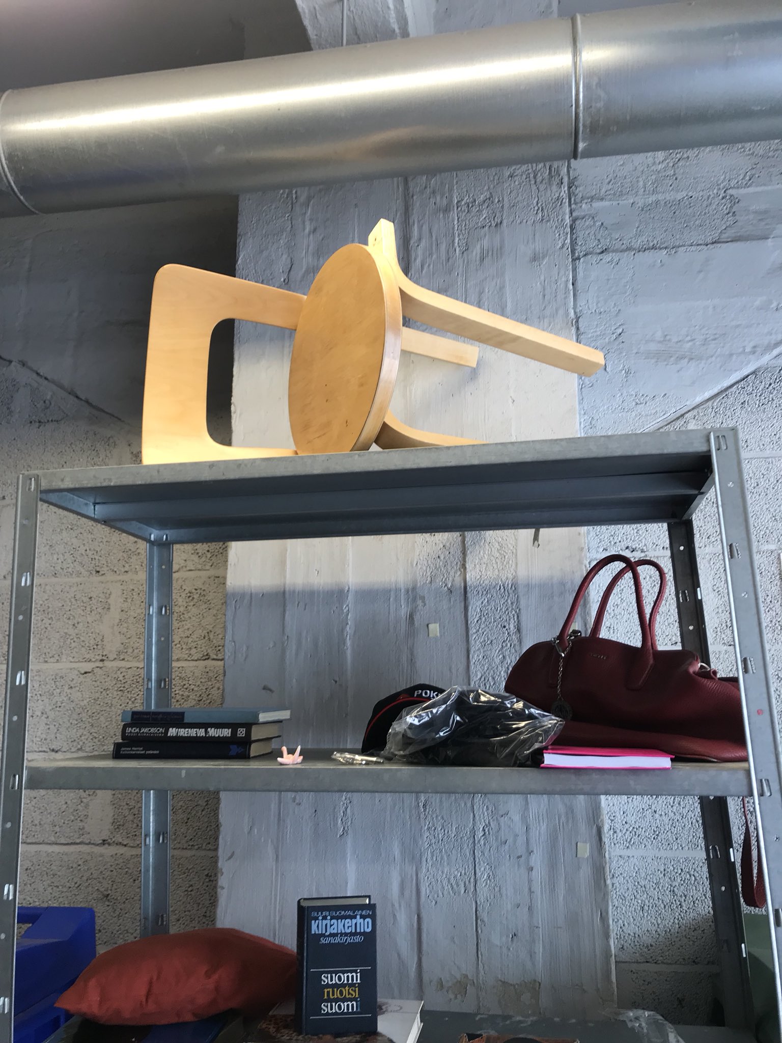 アルッピラに住んでいた時は、建物の共通のゴミ捨て場にリサイクルコーナーがあって、毎日のようにラインナップが変わるほど盛んに使われていました。この棚から本や雑誌、キャンドルなど色々もらってきましたが、一番ビックリしたのはアアルトチェアを発見した時。買ったら4万円以上する椅子…。修理して使うことにしました。捨てる神あれば拾う神ありです。
