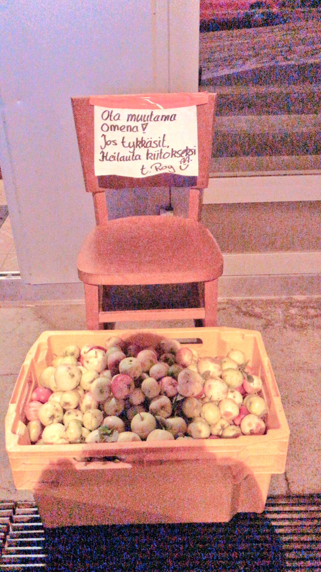 このゴミ捨て場の棚では「きゅうりがたくさん採れすぎたのでどうぞ」ときゅうりが大量に並んでいた時もありました。フィンランドではよく街中で「もし良かったらりんごどうぞ」の箱も見かけます。採れすぎて食べられないので、近所のの人で欲しい人がいたらもらって欲しいという人が非常に多いのです。不要なものを譲り合う文化、かなりハートウォーミングです。
