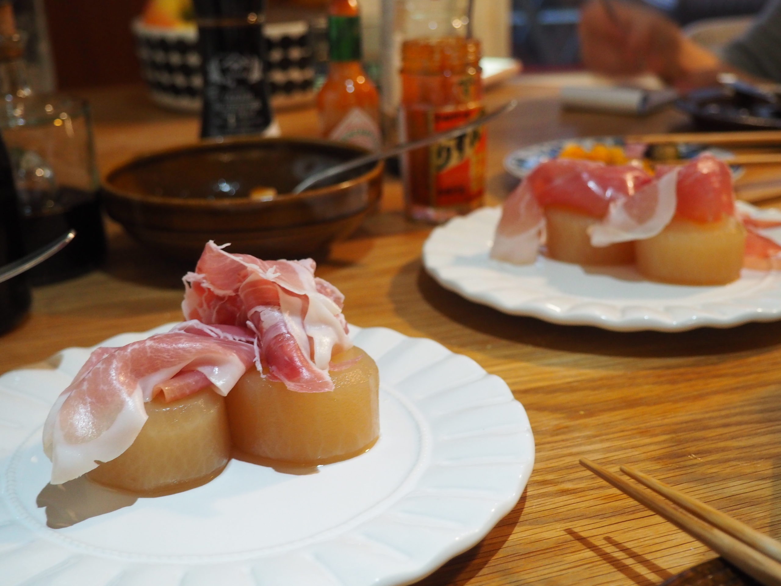ちなみに前回はモッツァレラチーズを味玉に見立ててタレに浸し、塩麹を和えたトマトと一緒に和風カプレーゼとしてお出ししたり、手打ちうどんで和風カルボナーラうどんを〆にご提供したりしました。借りているレストランはイタリアから産地直送で素晴らしいハムやチーズを入手しているので、最高級プロシュートハム「プロシュット・ディ・サン・ダニエーレ」を譲ってもらいました。ご招待したいつもは頭が堅いイタリア人オーナーも、「生ハムと大根が合うなんて!とっても美味しかったよ!」と言ってくれました。