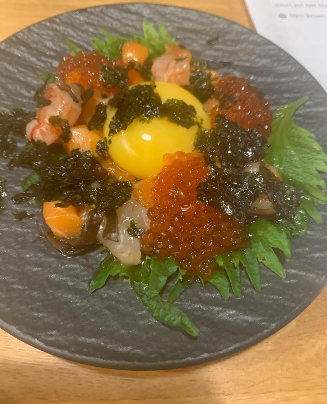 前回・前々回とお刺身をご提供していたので、今回は生魚を使った、違う形の料理を食べてもらいたいなと思っていました。前々回はハマチのなめろうもお出ししていたので、今回は韓国のユッケから影響を受けたお料理に決定しました。