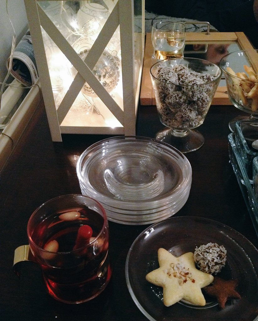 ヨウルトルットゥのお供はグリューワイン、Glögi(グロギ)。16世紀から北欧諸国でクリスマスの時期の伝統的な飲み物として飲まれてきました。レーズンやアーモンドを入れて飲むのが習慣で、クローブ、シナモン、カルダモンなどスパイスたっぷりなので、飲むと身体が一気に温まります。ワインといっても、こちらのものは基本的にジュースのようにアルコールが含まれていないものがメインなので、飲むときにグラスにひっそりとラムやウォッカを注いで、Glögiで割って飲むという罪深い飲み方をする人も多いです(私もその一人)。香り高い風味、赤い色合いが特別感を盛り上げてくれます。