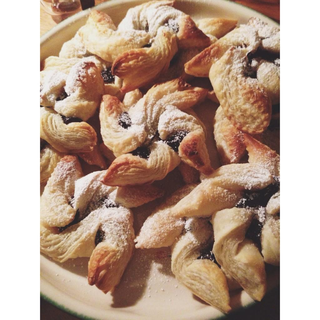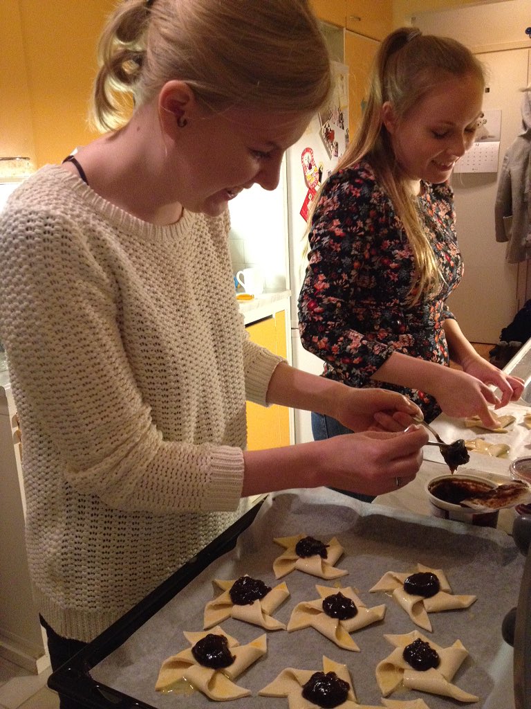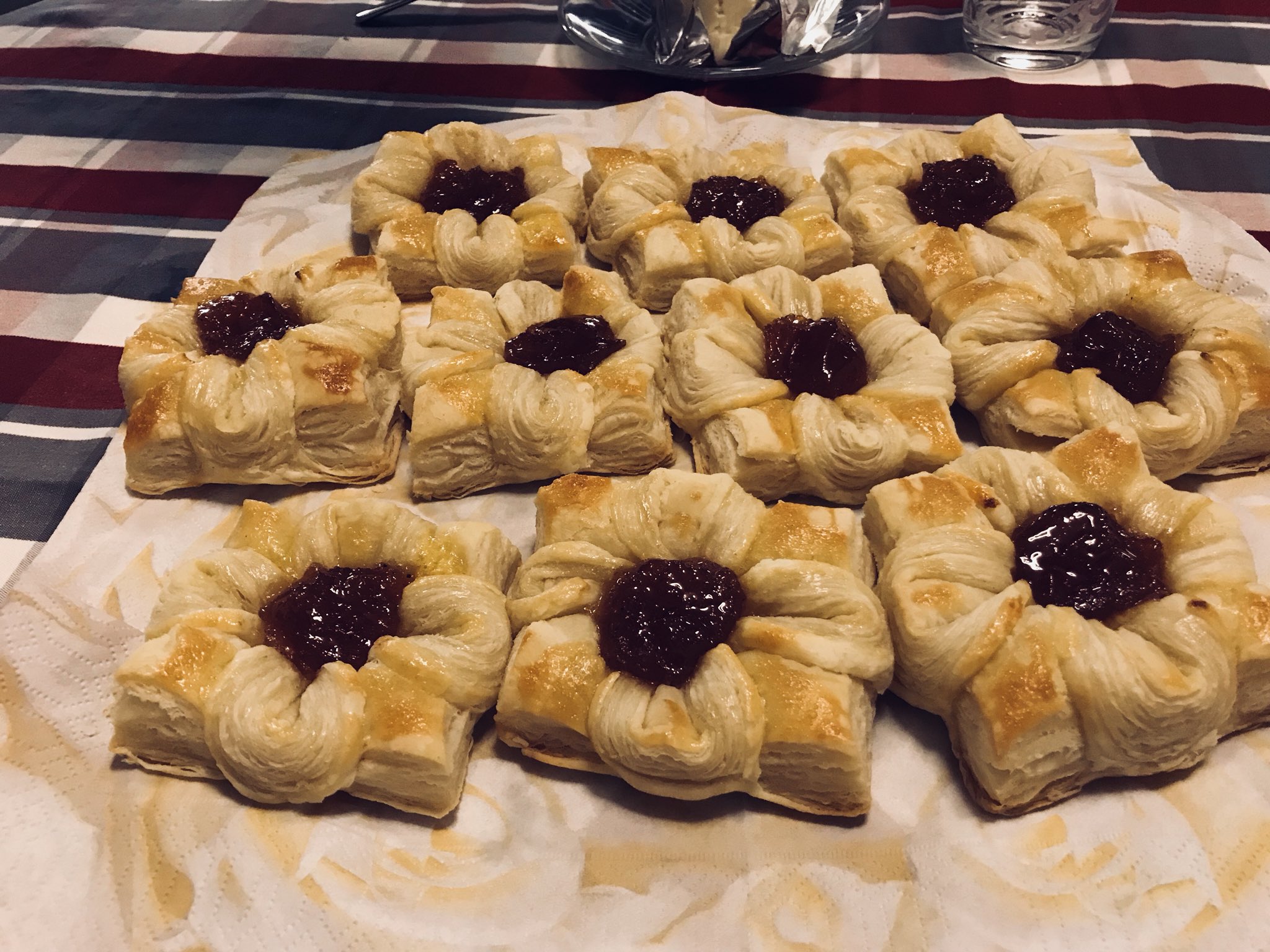 この時期のフィンランドでよく食べられるお菓子のひとつが、Joulutorttu(ヨウルトルットゥ)です。Jouluはフィンランド語で「クリスマス」という意味で、torttuは「タルト」という意味ですが、パイ生地にプルーンやリンゴジャムなどを乗せて焼くお菓子なので、サクサクのパイの食感です。手裏剣に見えますが、「お星様」を模しているそうです。
