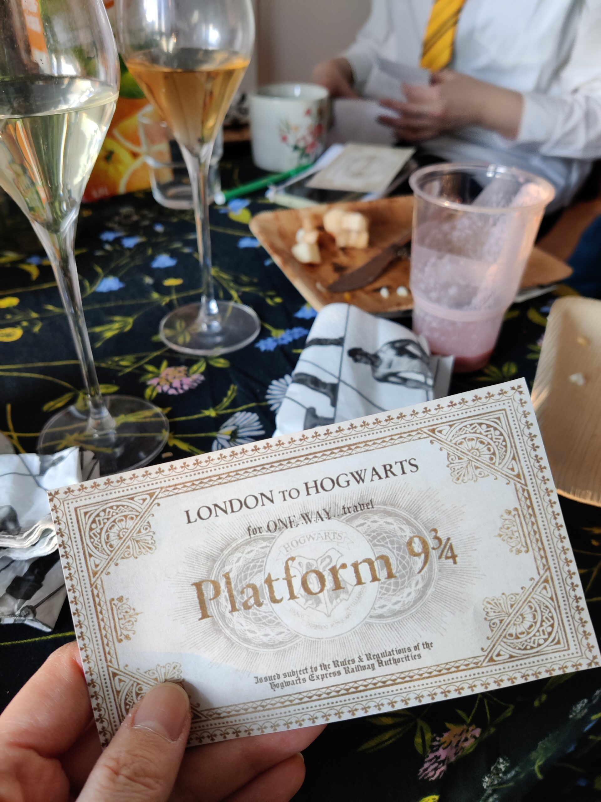 マジックポーション(ウォッカに色付けしただけ笑)に魔法の杖、そしてロンドンからホグワーツ行きの9¾ プラットフォームのチケットが全員に配られ、いざ次の場所へ。
