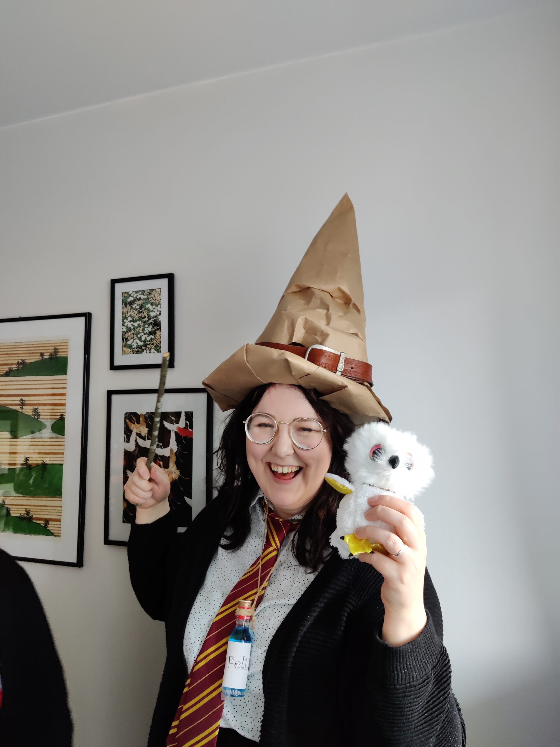 子どもの頃からハリーポッターが好きだったティーナのバチェロレッテパーティーのテーマは、ティーナの妹と親友の提案でホグワーツ魔法学校入学式。手作りの組み分け帽子を被って、まずは寮分け。もちろんティーナはグリフィンドール!メイクをしてハリーの傷もおでこに入れて気分はすっかりハリーポッター。「子どもの頃の夢がついに20年後の今、かなった!」と大喜びでかわいかった。