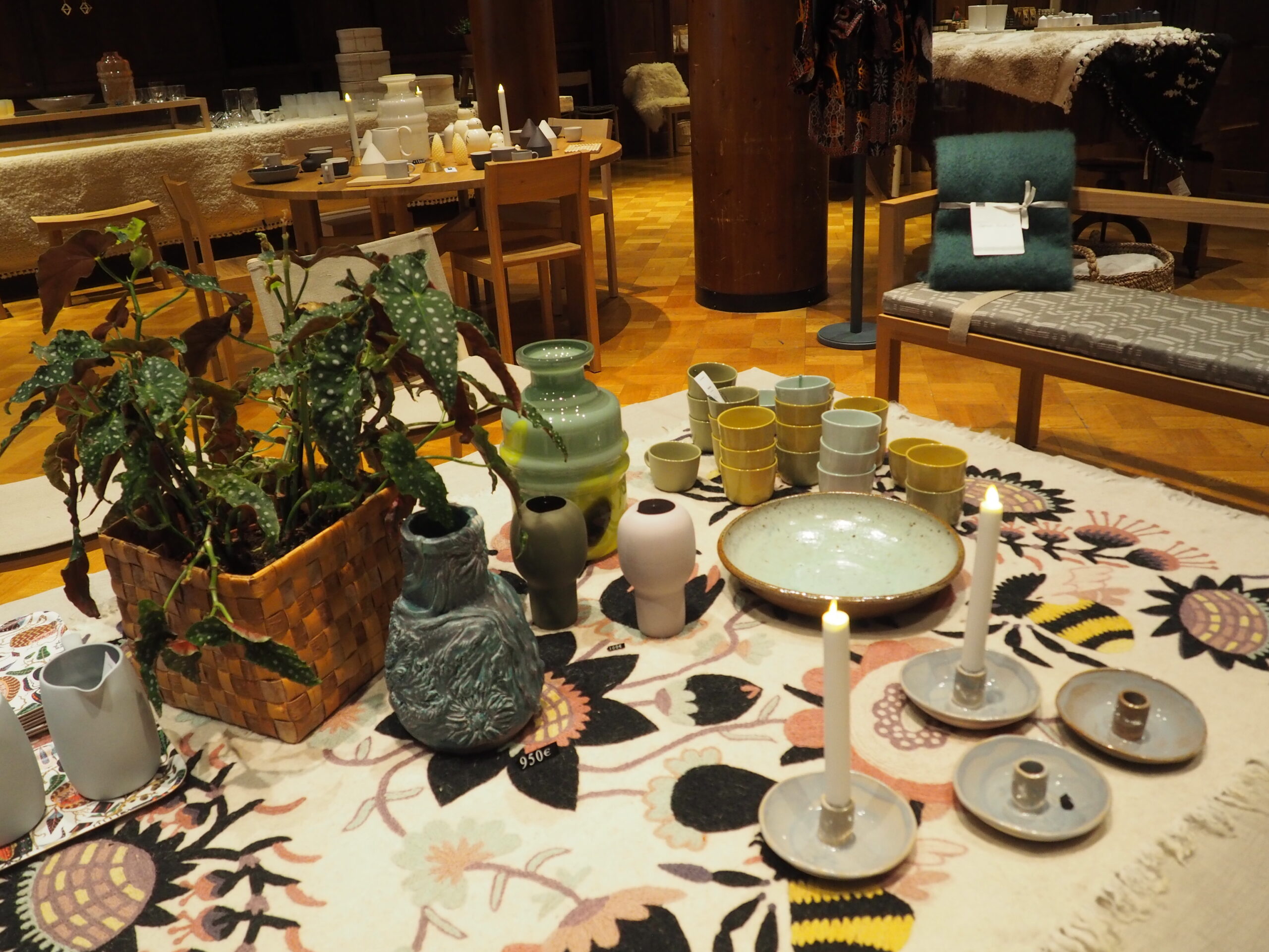 大広間には手作りのラグ、陶器やビーワックス(蜜蝋)で作られたキャンドル、ヒンメリ(藁で作った多面体で光を表現したフィンランドの伝統のモビール)、木の皮で作られた籠や日本の曲げわっぱような容器、アクセサリーなど、国内の新進気鋭または評価の高い経験豊富なデザイナーやアーティスト、手工芸作家によるデザインプロダクツが心地よく配置されています。