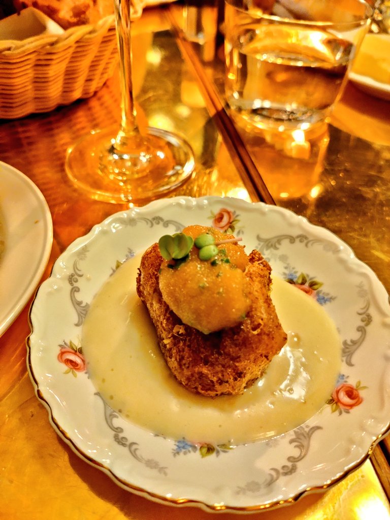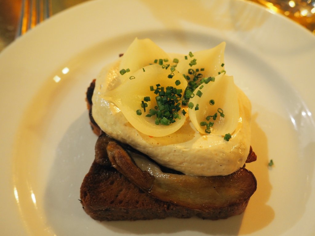 白子のピュレ、揚げたもの、卵のソース。フィンランドで白子食べたの初めてなので感動!
