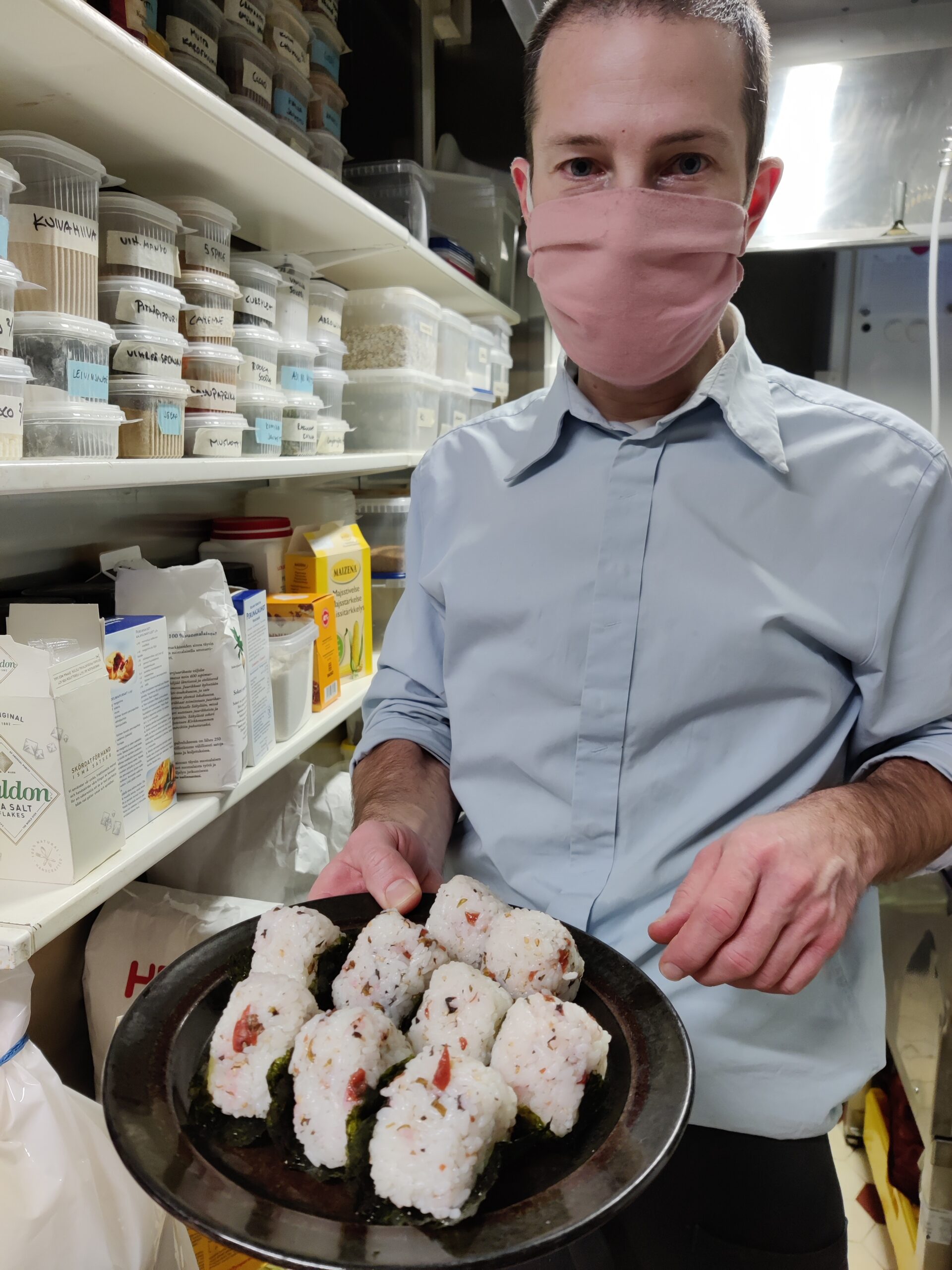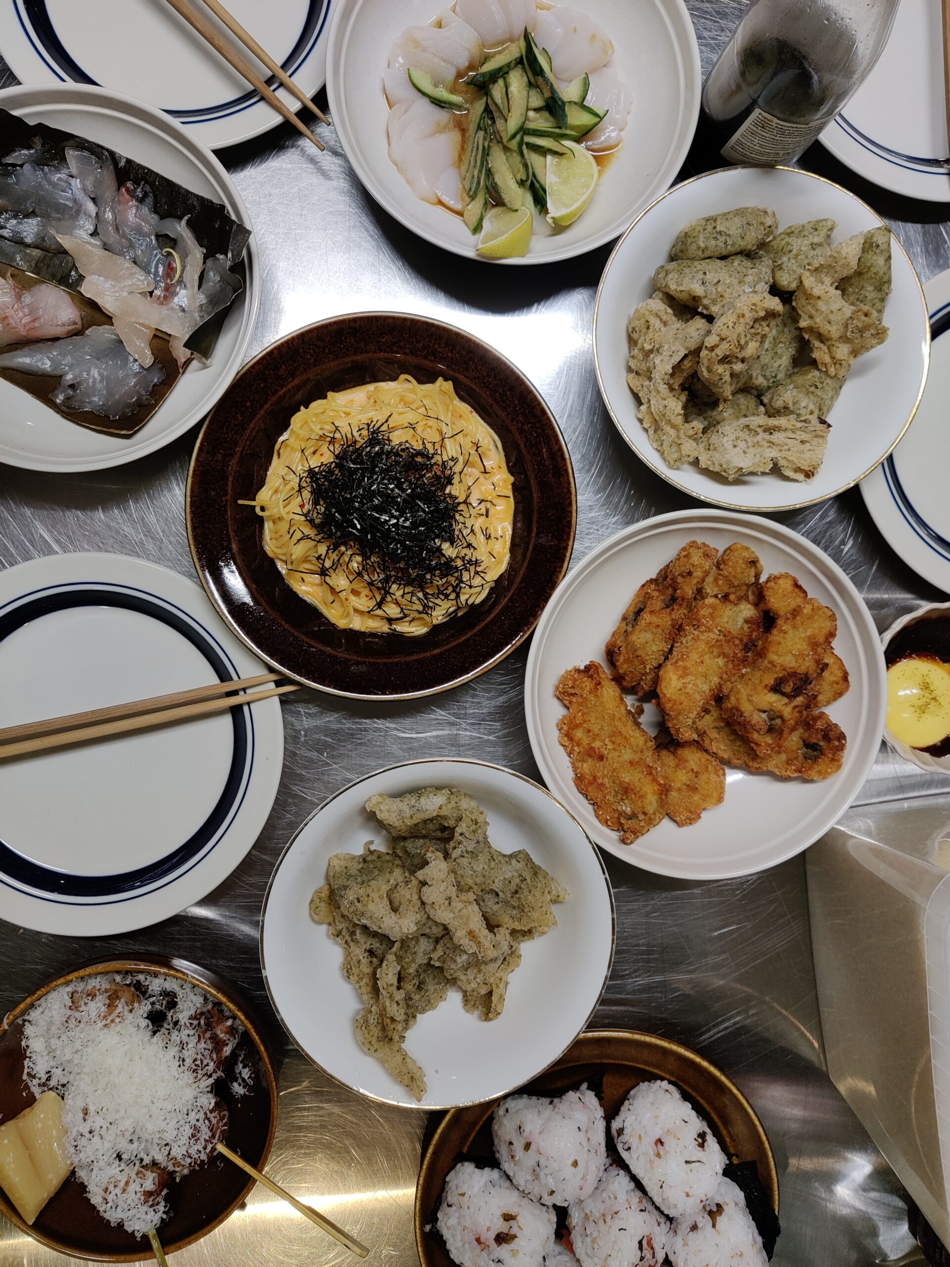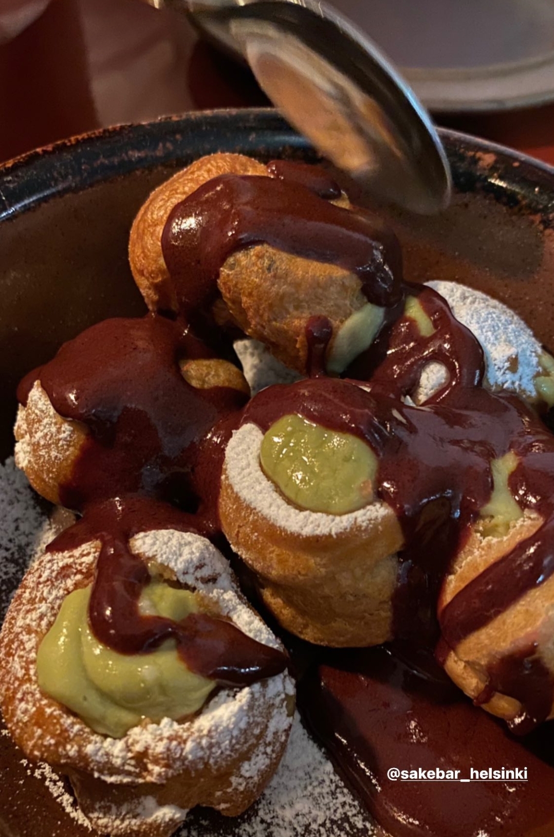 今回のポップアップではホワイトフィッシュの昆布締めや揚げ出し豆腐、鶏つくね串のパルミジャーノ・レッジャーノがけやカキフライ、辛子明太子スパゲッティや梅紫蘇おにぎり、抹茶クリームと苺の入ったシュークリームに豆腐チョコレートソースをかけたものなどをご用意しました。