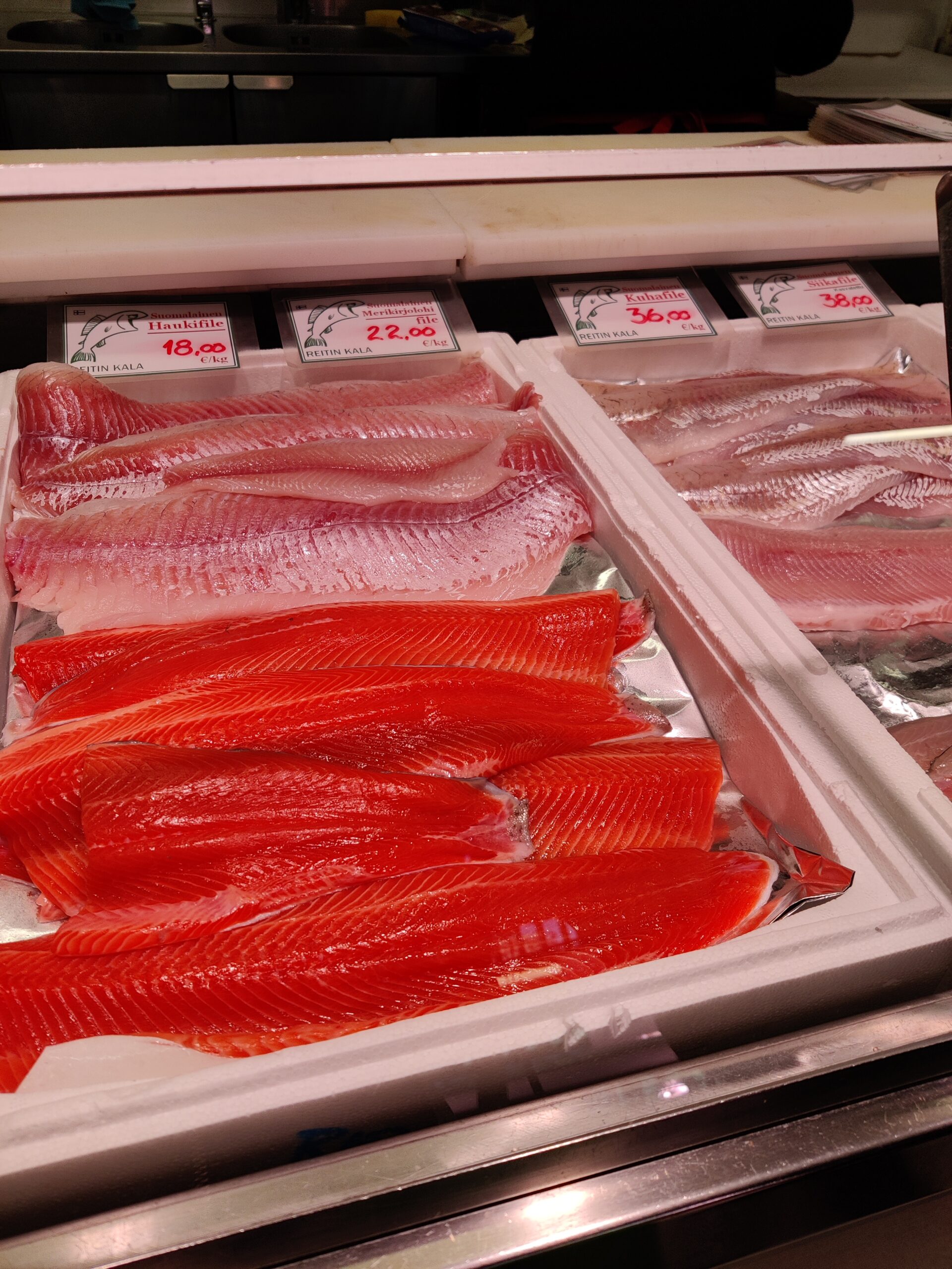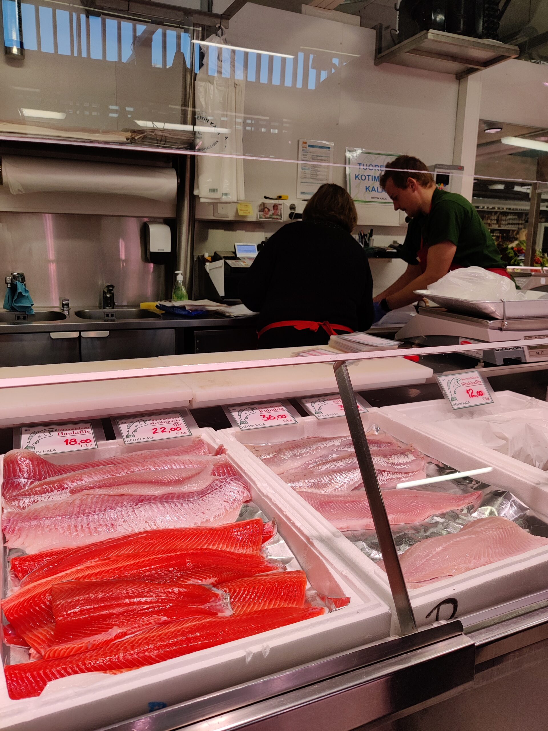 朝からマーケットホールに行って新鮮な魚を仕入れます。Hakaniemen Kauppahalliにある「Reitin Kala」が最近のお気に入りです。ボスが女性であること、またベンヤミンの故郷の近くの海で穫れた魚を仕入れてヘルシンキで売っているのも魅力です。