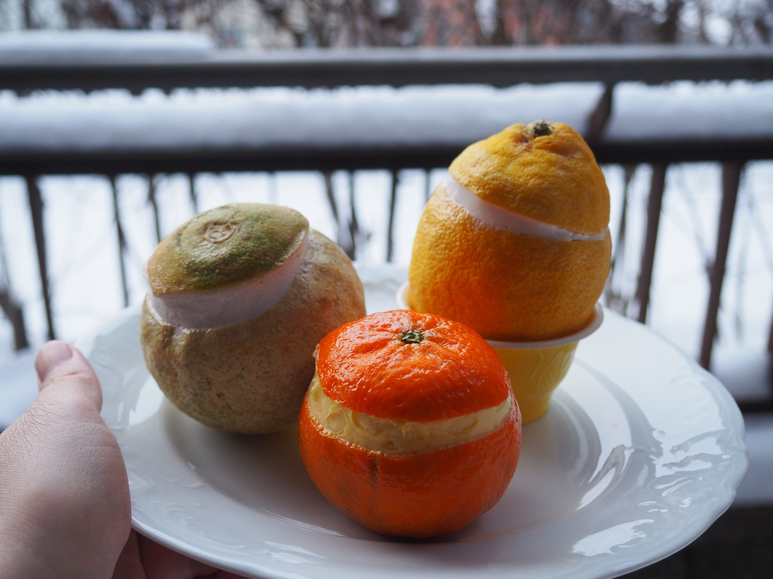 最寄りのイタリアンジェラート屋さんでかわいいジェラートが売っていたのでつい買ってきてしまいました。ベルガモット、クレメンタイン、レモン。中には果汁たっぷりのジェラートが詰まっています。