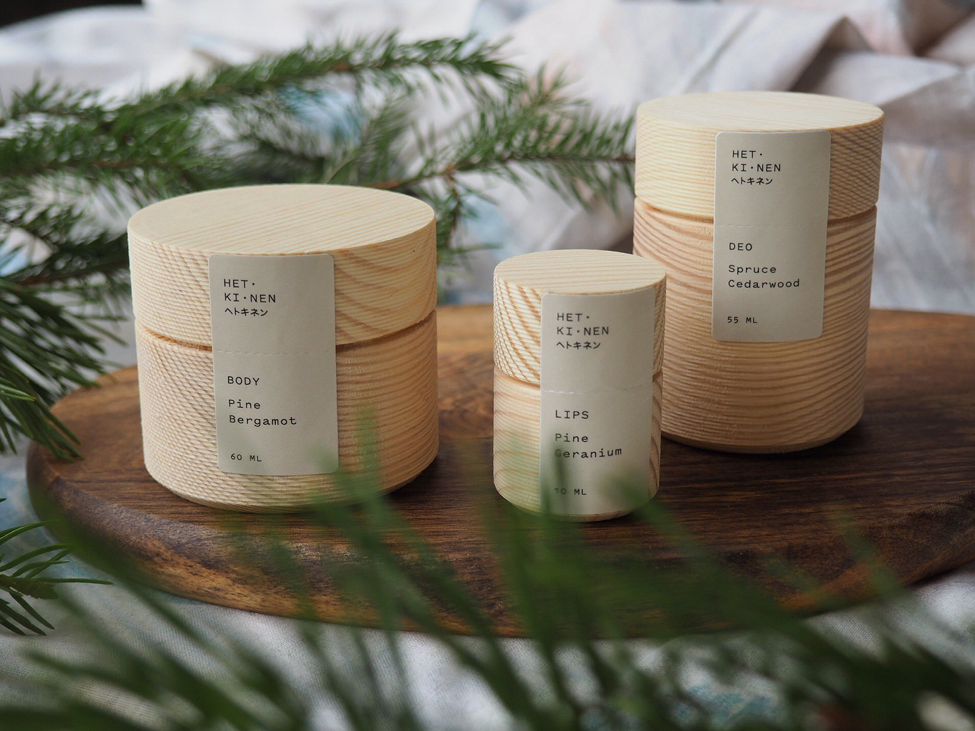 『ヘトキネン(hetkinen)』という名前はフィンランド語で「ちょっと待って」という意味。日々のストレスや外部の不純物によるダメージで疲れた時など、つかの間の一瞬でも北欧の自然に触れて欲しいという願いが込められているそう。松、白樺、モミの木などの北欧の香りが私たちを包み込んでくれる。