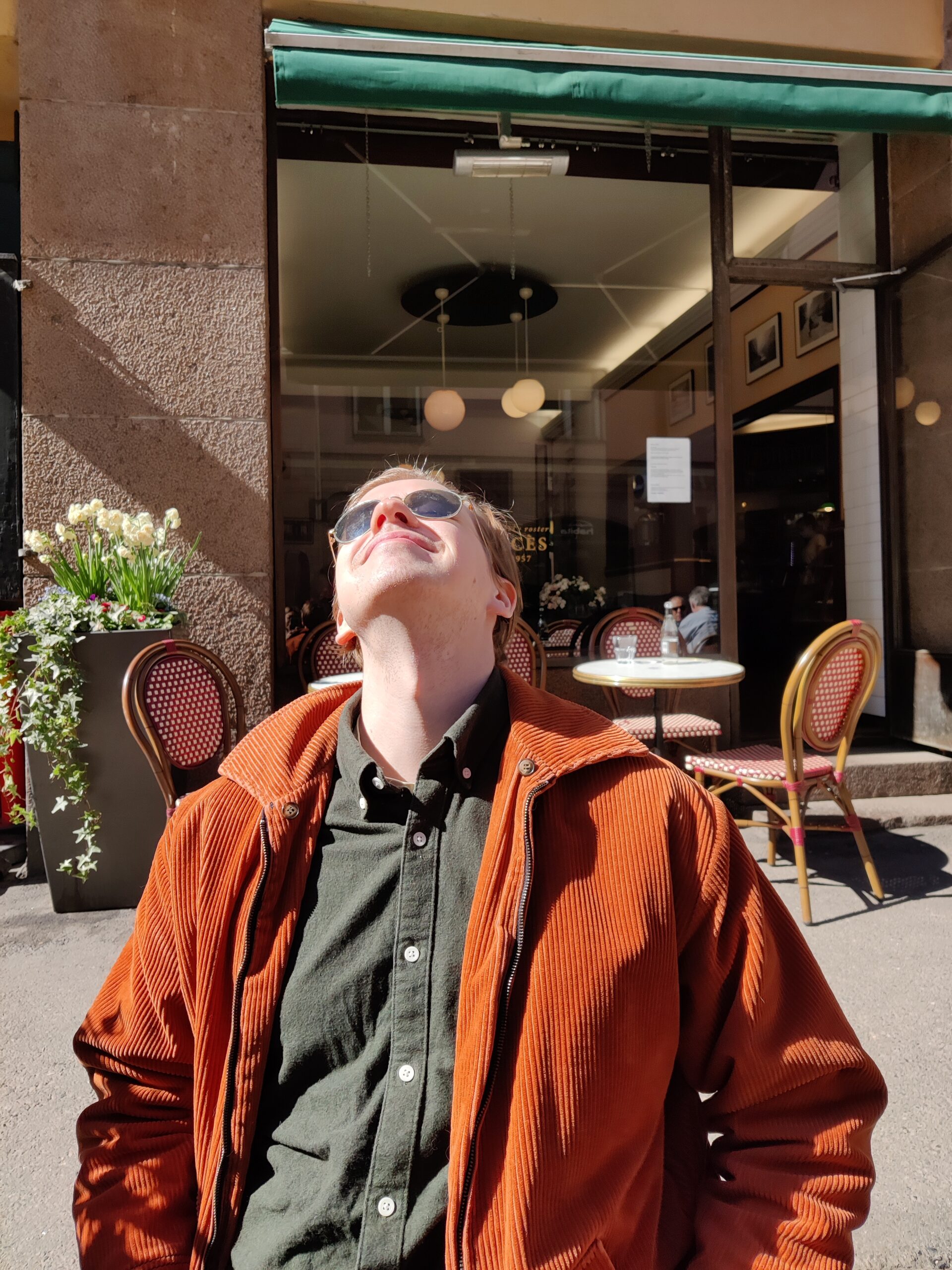 行きつけのカフェで友達と会ってコーヒーが飲めること、そして春が来て青空のもとで外のテラスに座ってコーヒーが楽しめること。ダブルでみんな嬉しそうです。