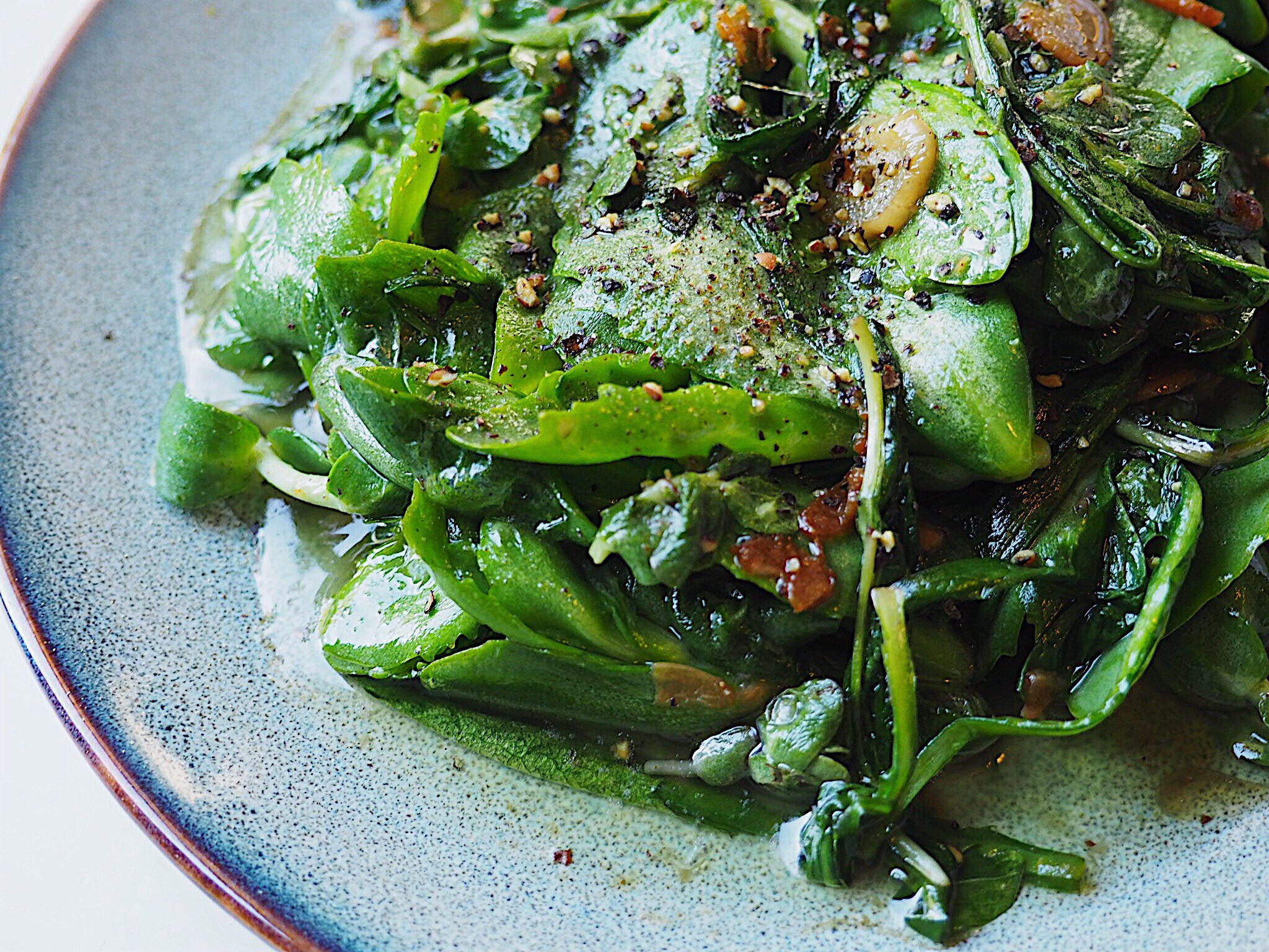 庭に自生するムラサキベンケイソウとvoikukka(タンポポ)の茎と草の部分のガーリック炒め。ごま油と美味しい醤油をひと垂らしすれば20円もしない一品の出来上がり。