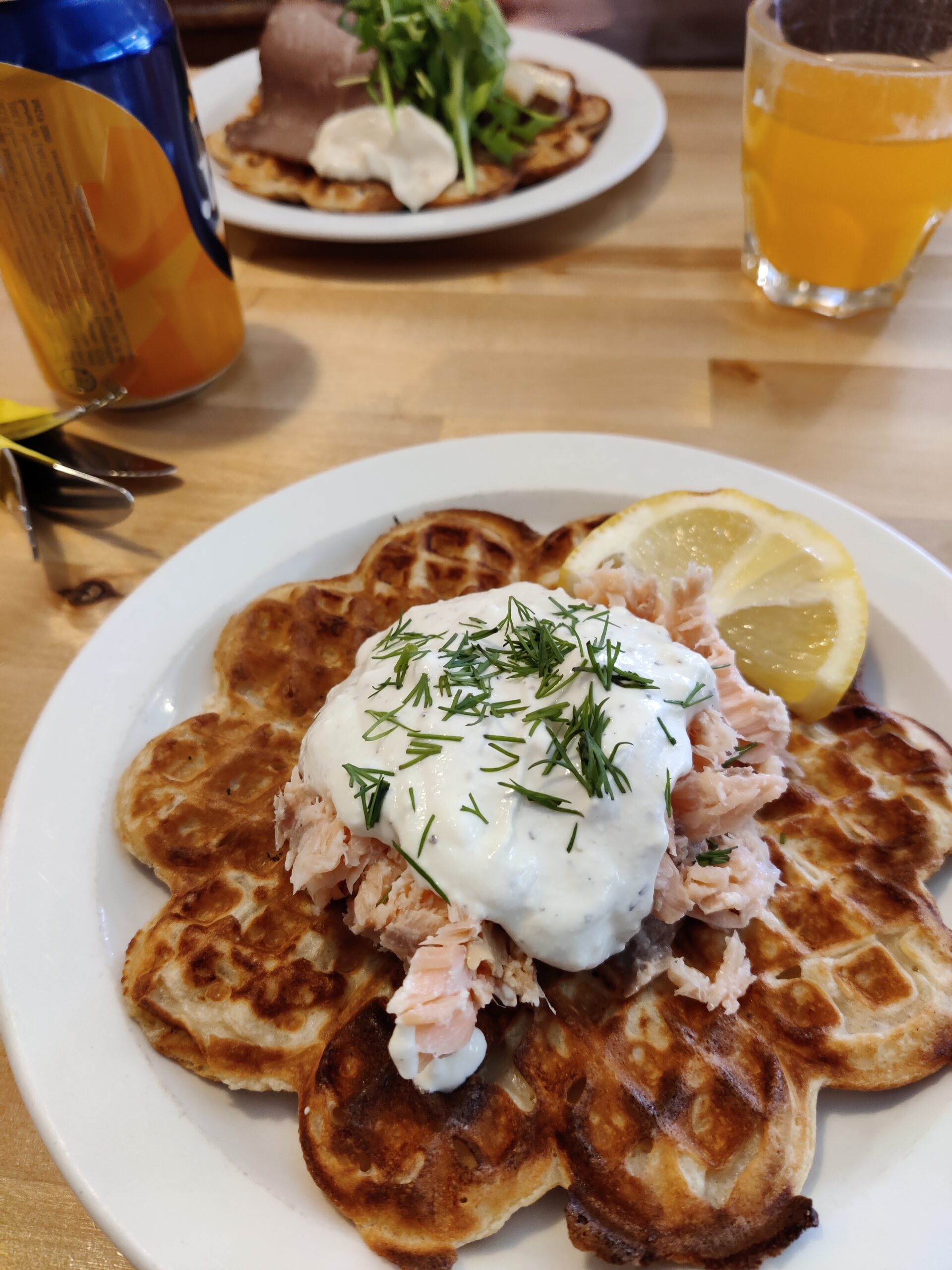 私はスモークサーモンのワッフル、ベンヤミンはローストビーフのサーモンを注文しました。