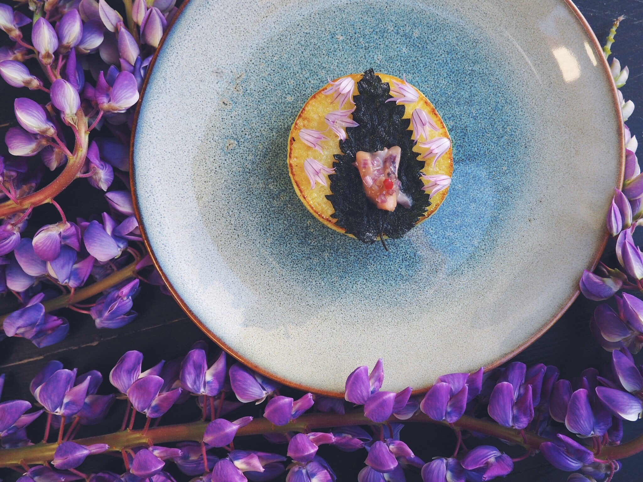 昆布だしで煮込んだ大根のターメリックバター焼き、イラクサのチップと小葱の花、塩辛の紅水菜の和え物。