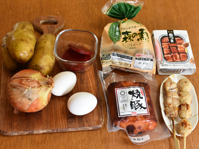 焼き豚、ソーセージ、焼き鳥(塩だれ)、缶詰のベーコン。焼き鳥はももとつくねです。スウェーデンでは残り物のミートボールを使うこともあるので、つくねはありでしょう。なんなら市販のハンバーグやスパム缶もいいかも知れない。せめて2種類、できれば3種類は集めたいところ。
