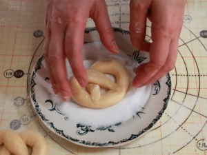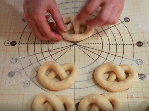 6.冷蔵庫から取り出した生地を6等分して、40cmくらいの長さに棒状に丸め、プレッツェルの形に成形する。
