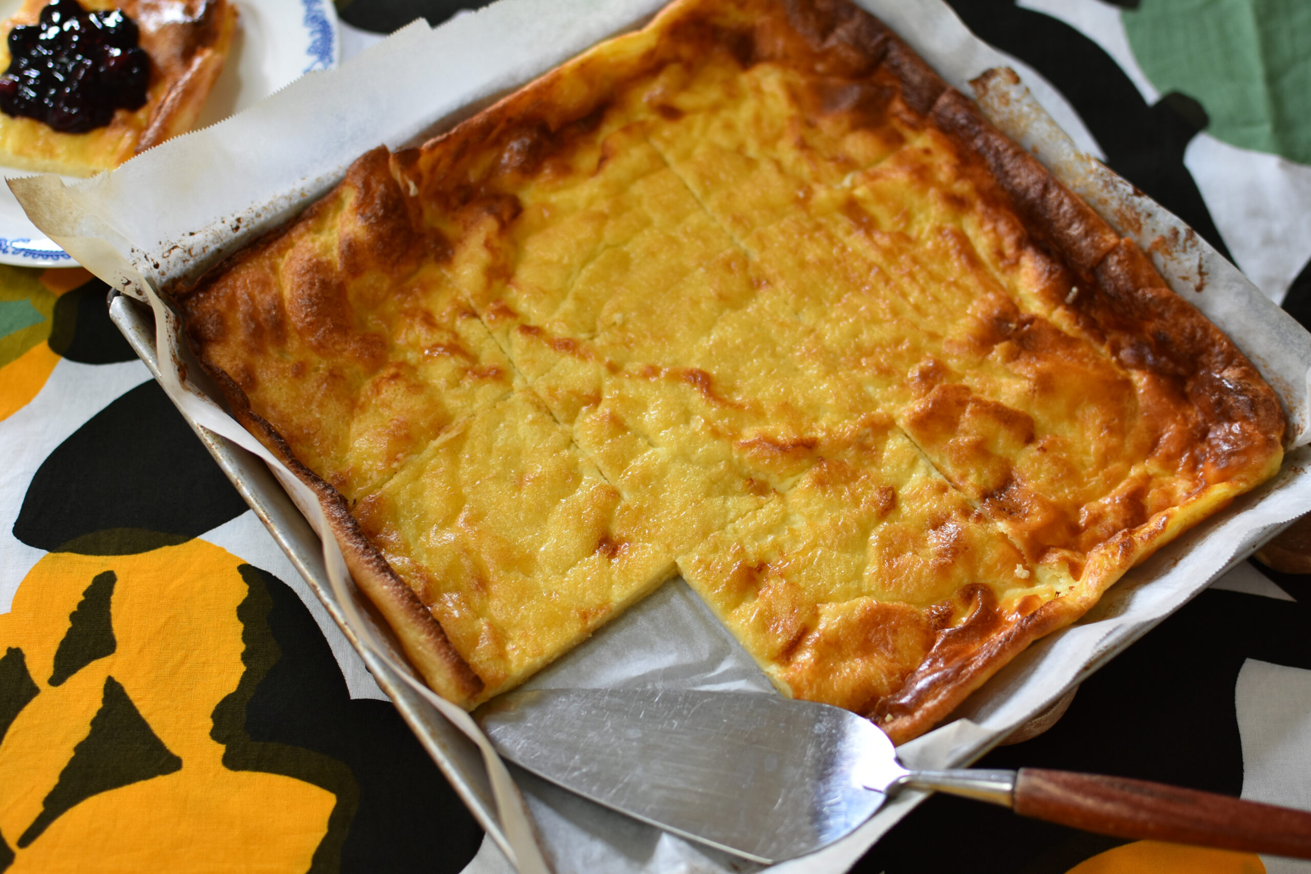 フィンランドには独特なパンケーキ、パンヌカック(Pannukakku)があります。パンケーキは通常フライパンで焼くものですが、パンヌカックはオーブンで大きく焼き上げ、カットして食べます。