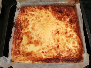 フィンランドのグルテンが多い小麦粉に合わせて、強力粉と薄力粉を混ぜていますが、強力粉だけでも薄力粉だけでもいいですし、中力粉でもいいです。生地の水分が多く小麦粉が沈みやすいので、天板に入れる前に良くかき混ぜ、天板に入れたらすぐにオーブンに入れて、焼き上がりが2層になるのを防ぎます。