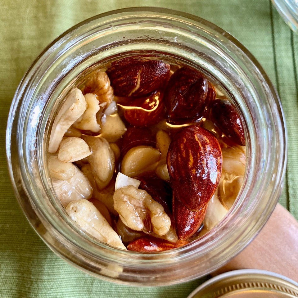 『ナッツの蜂蜜漬け』は、はちみつに含まれるビタミン・ミネラル・酵素に加え、ナッツ類に含まれるビタミン類もしっかり摂取できます。
