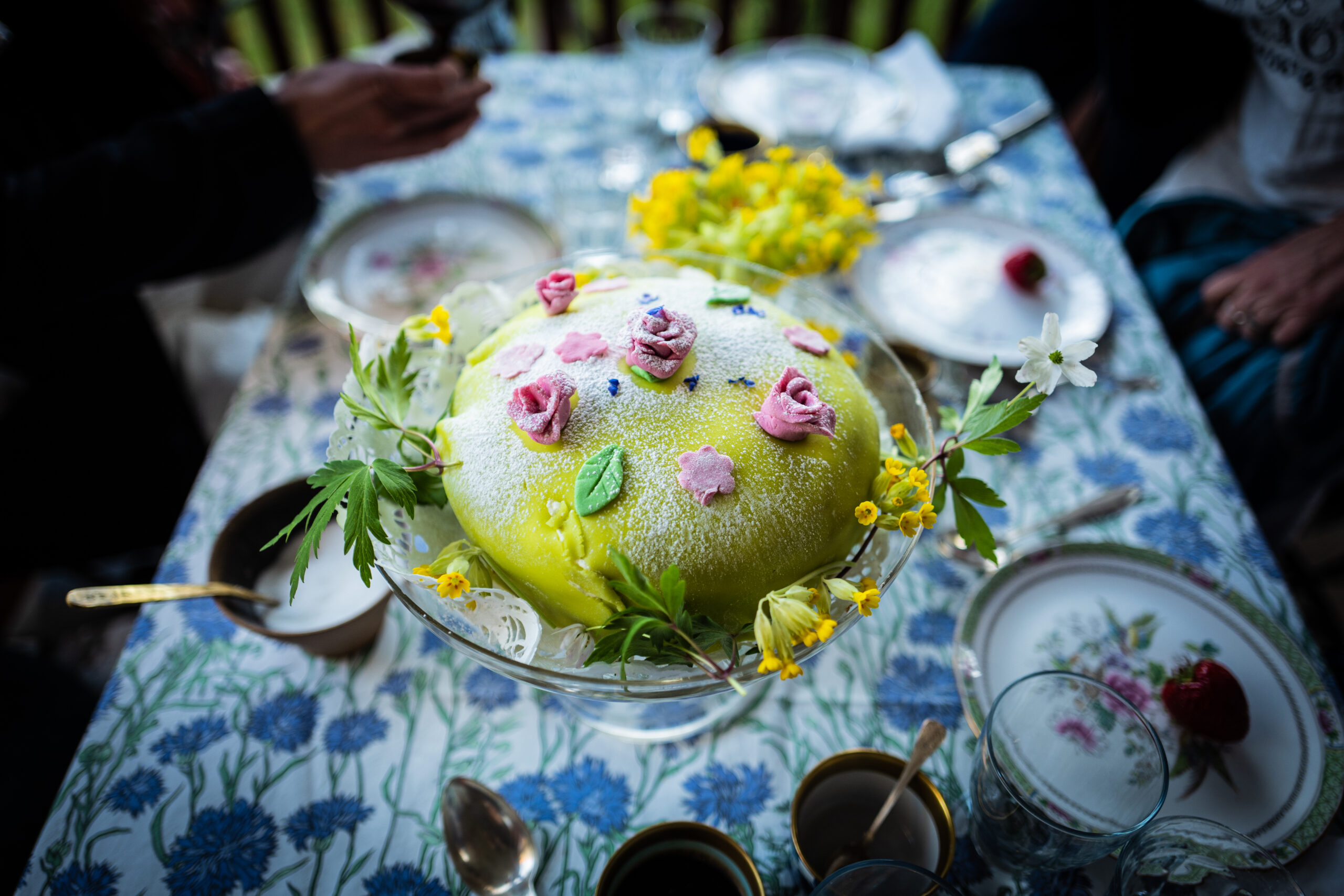 スウェーデンを代表するケーキ。スポンジ、ラズベリージャム、生クリーム、バニラクリームの層が緑色のマジパンで包まれ、同じくマジパンのピンクのバラがあしらわれている。誕生日パーティーはもちろん日常的なフィーカでも人気。