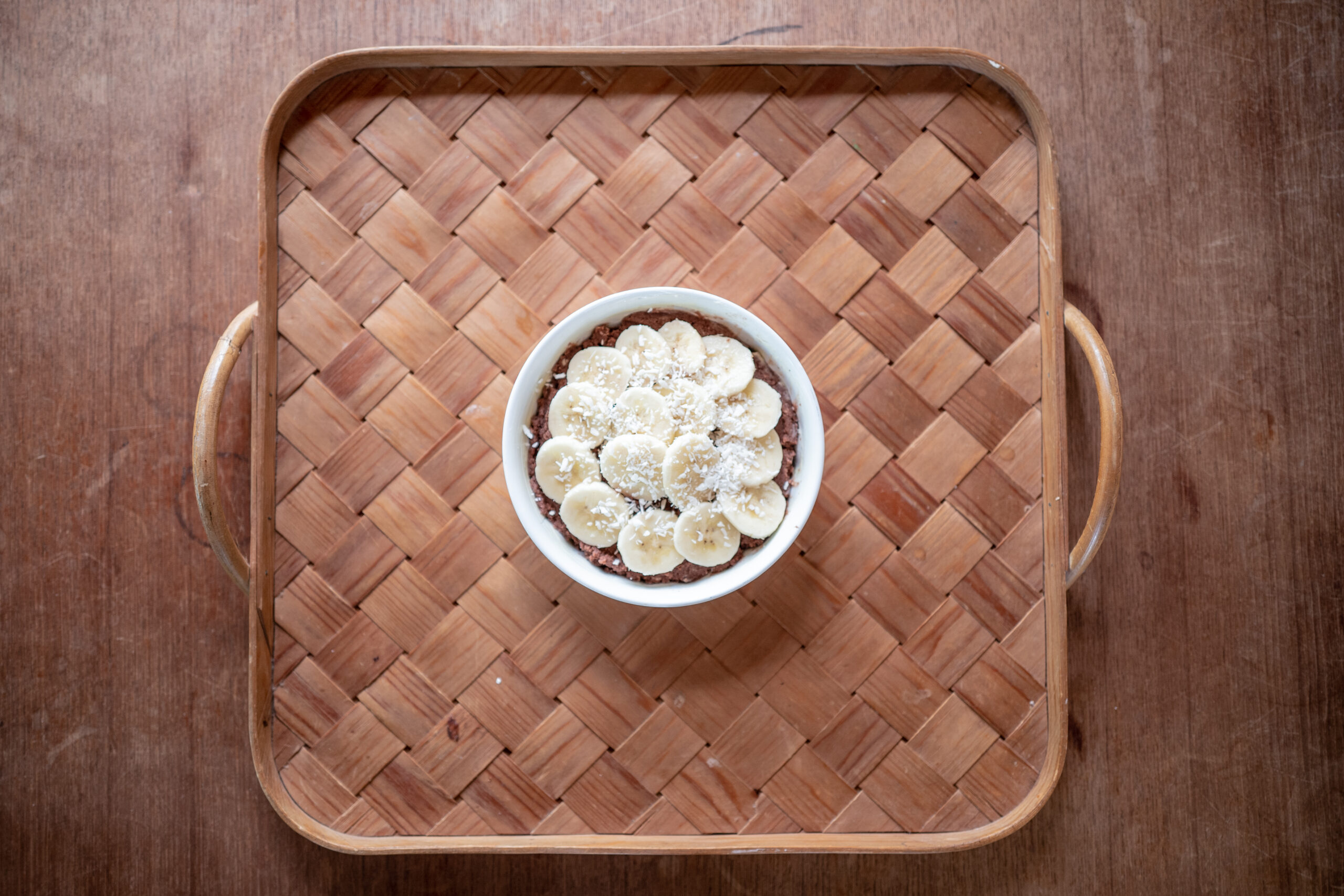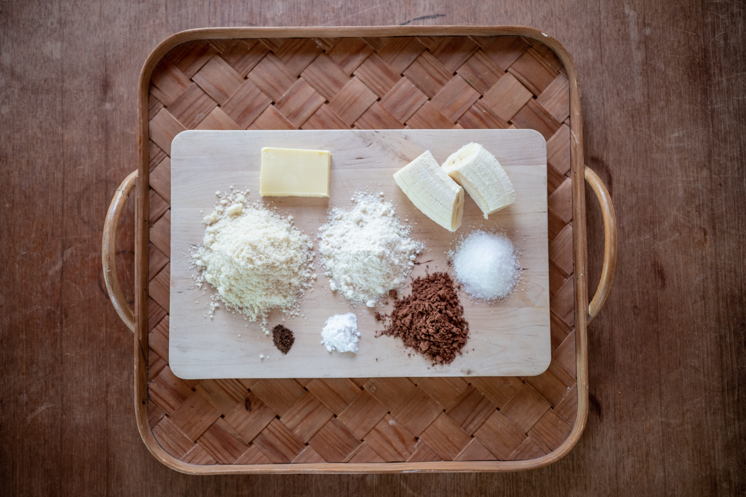 バター、バナナ、アーモンドパウダー、ココナッツパウダー、白樺の砂糖、ココア、ベーキングパウダー、そしてバニラパウダー。小麦粉は未使用。